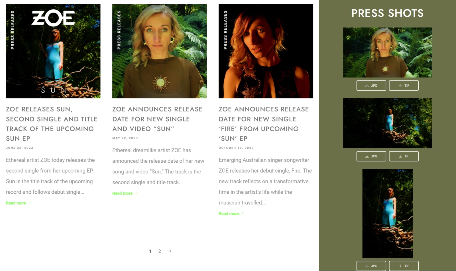 Zoe uses pagination to showcase her three latest press releases. This lets people easily access anything they might have missed while keeping her EPK neat and clutter-free.