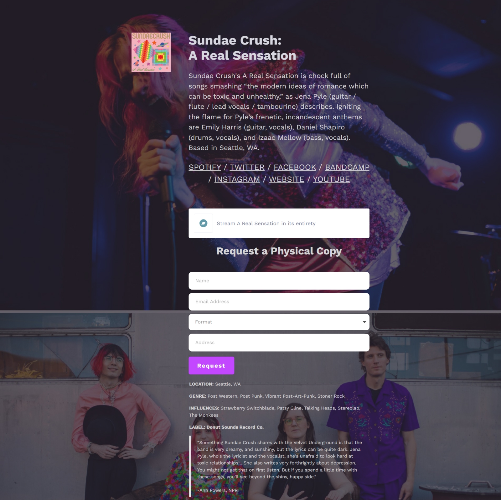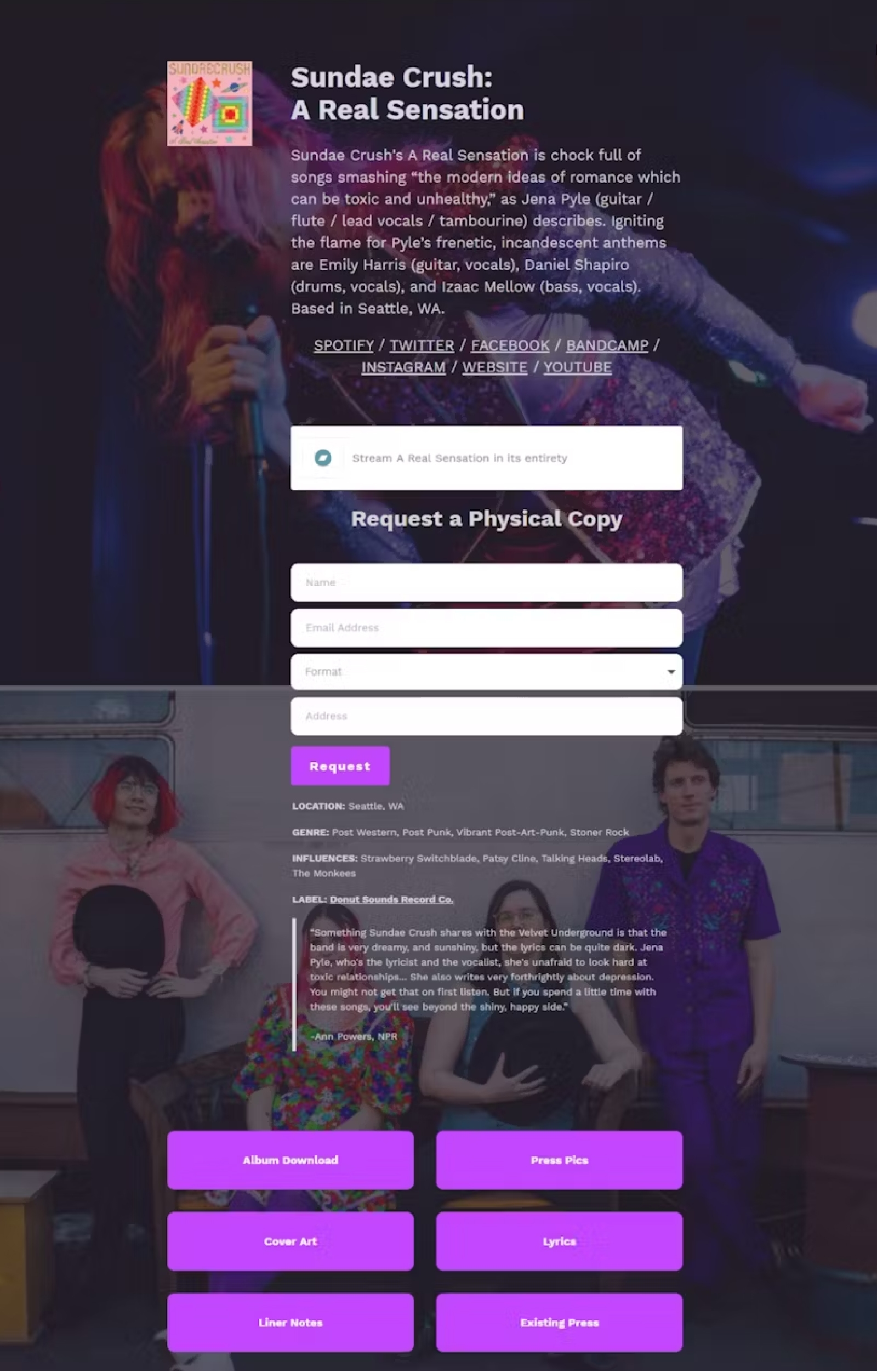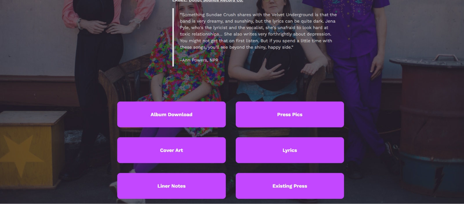 While building their EPK, Sundae Crush realized that the original black background on the EPK template didn’t match their aesthetic. But that wasn’t an issue since Kit’s landing pages are so customizable.