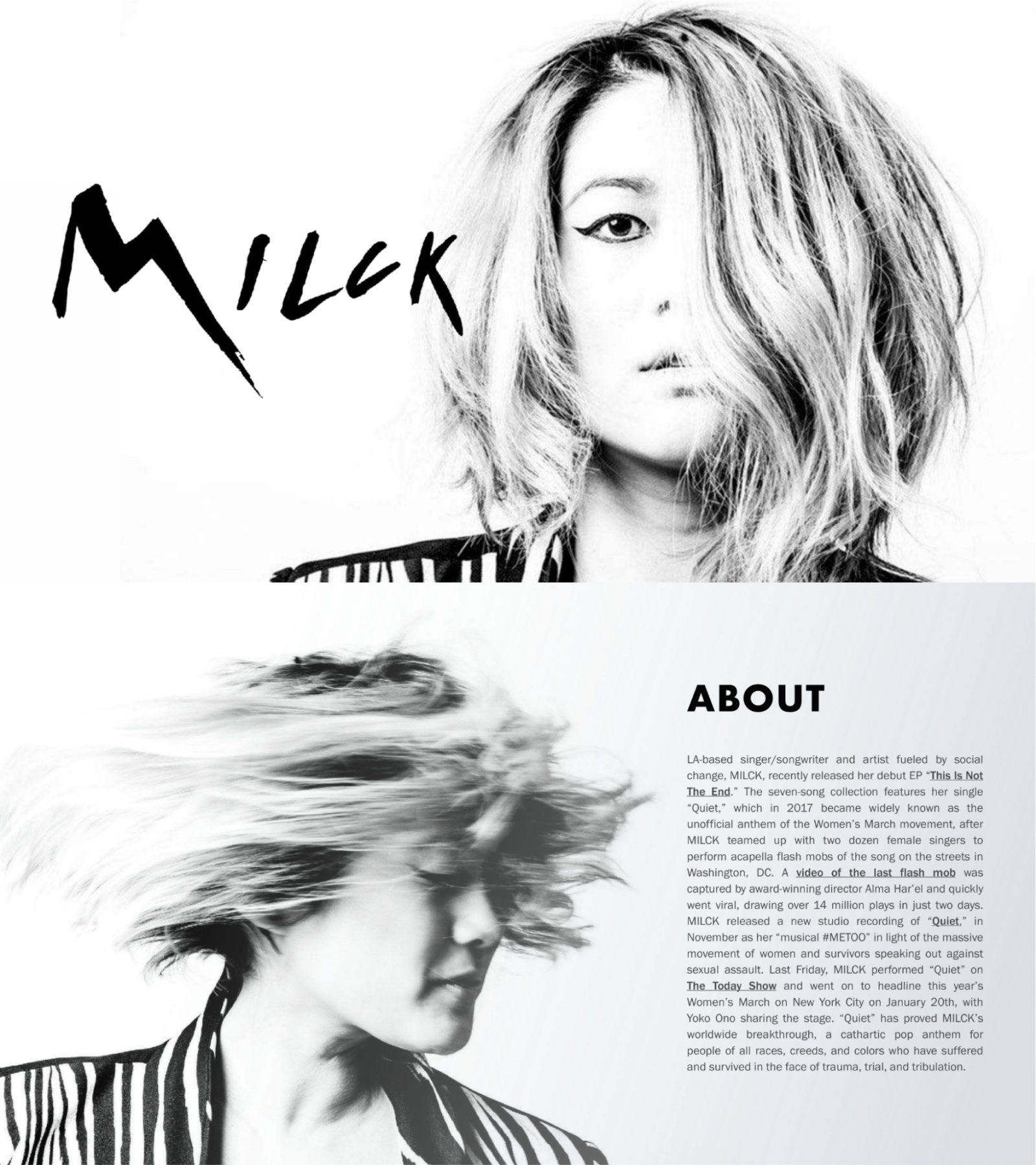 Milck includes sections to discuss herself as an artist, career highlights, press, music videos, booking information, and social links.