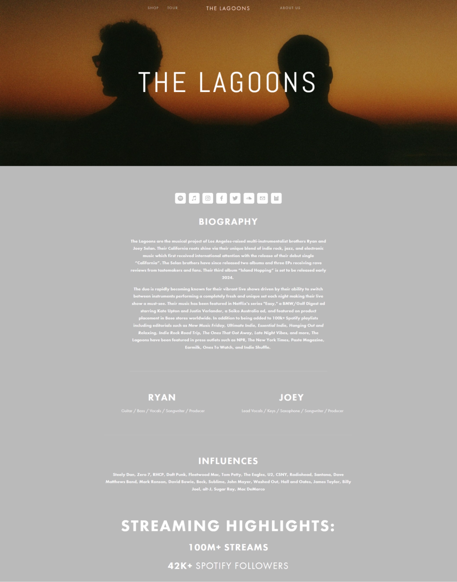 The band The Lagoons upload their EPK straight to their website. They’ve included information on their band, their influences, streaming highlights for added social proof, press coverage, music, and booking info.