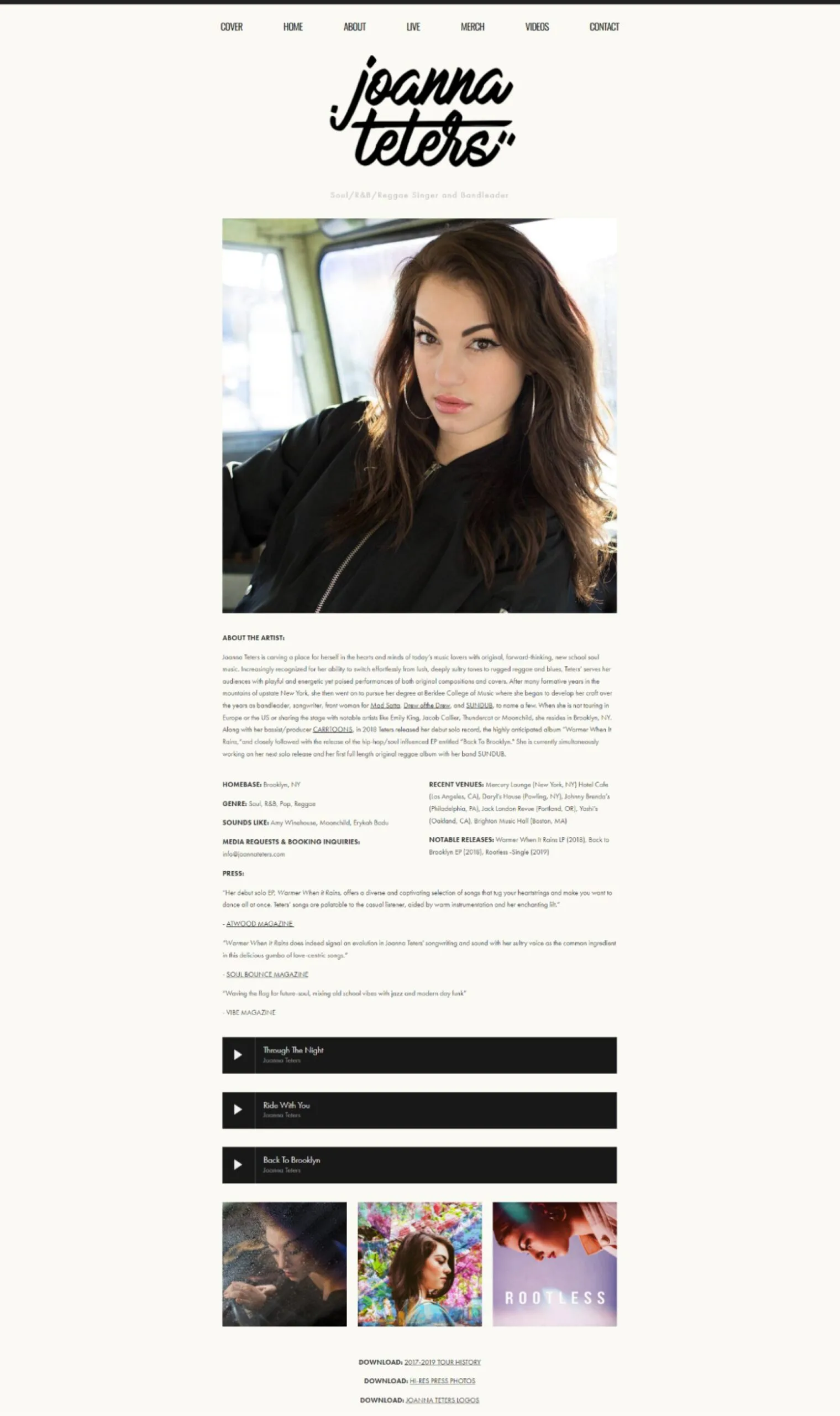Musician Joanna Teters also uses her website to host her EPK. On her EPK you’ll find album images, quality imagery, music videos, press, reviews, and more.