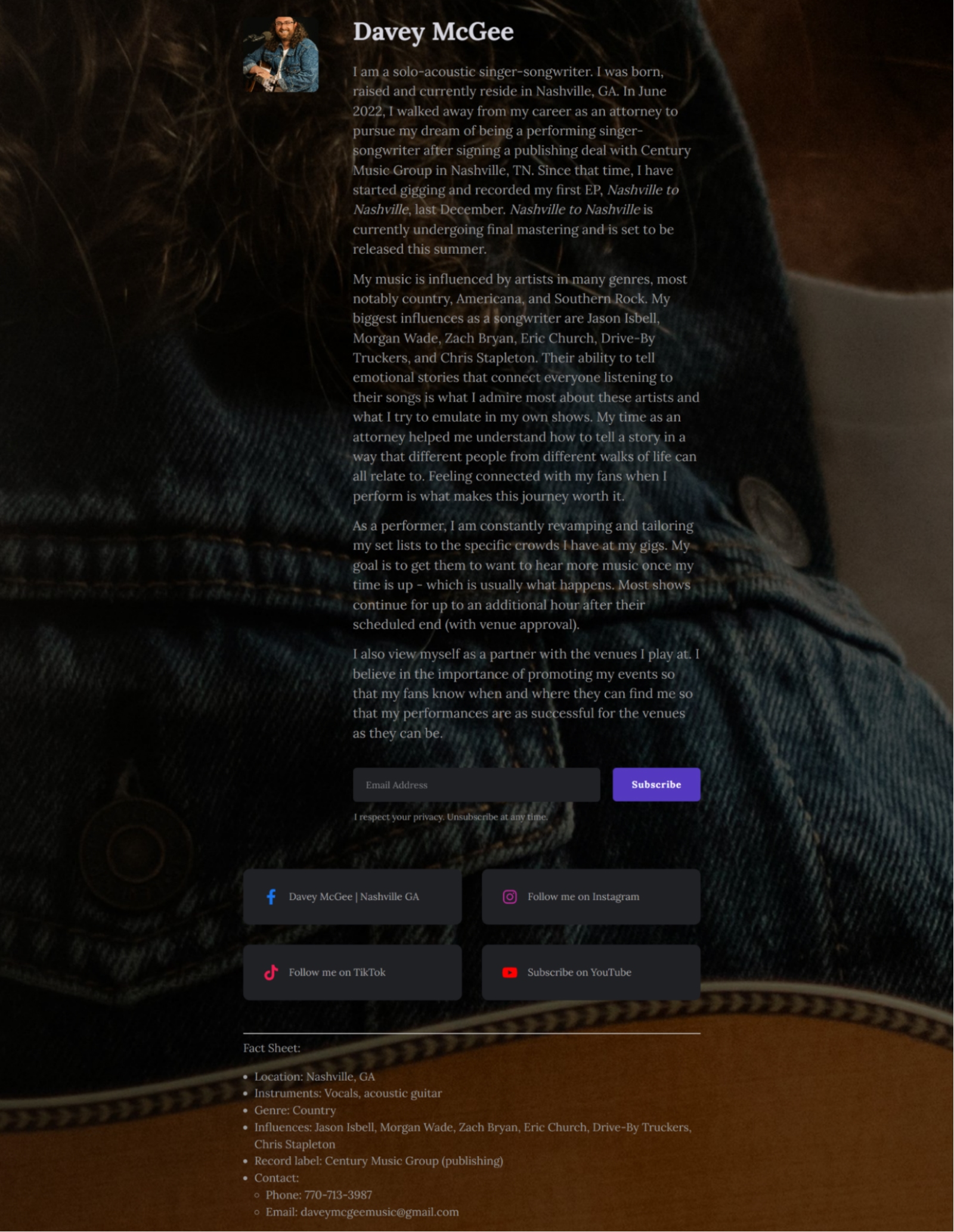 His EPK includes a bio, social profile links, a fact sheet, links to his social profiles, high-quality imagery, and an area to subscribe to his email list.