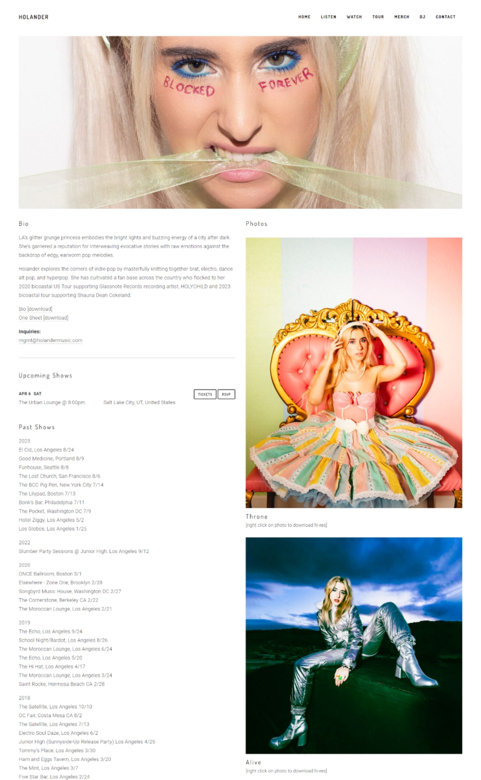 Singer Hollander’s EPK features a variety of music videos and media, along with her bio, downloadable items, songs, reviews, and more.