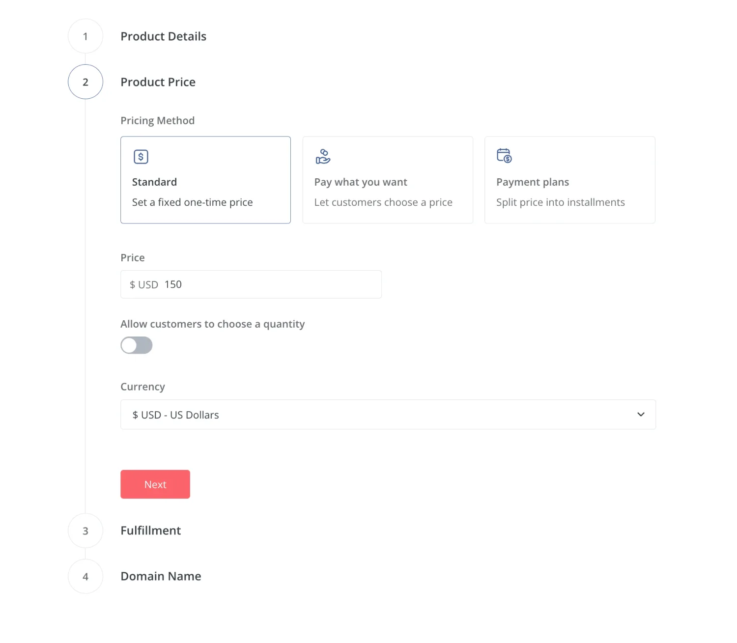 Step 2: Choose between a fixed one-time payment, a pay-what-you-want option, and a payment plan. Then, enter your price.