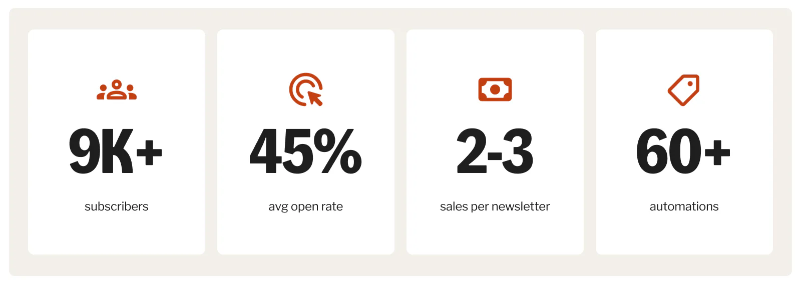Every weekly newsletter also generates 2-3 sales of his lower-priced products. His email list of 9,000 engaged subscribers (he regularly prunes anyone who hasn’t opened in six months) consistently performs with a 45% average open rate.