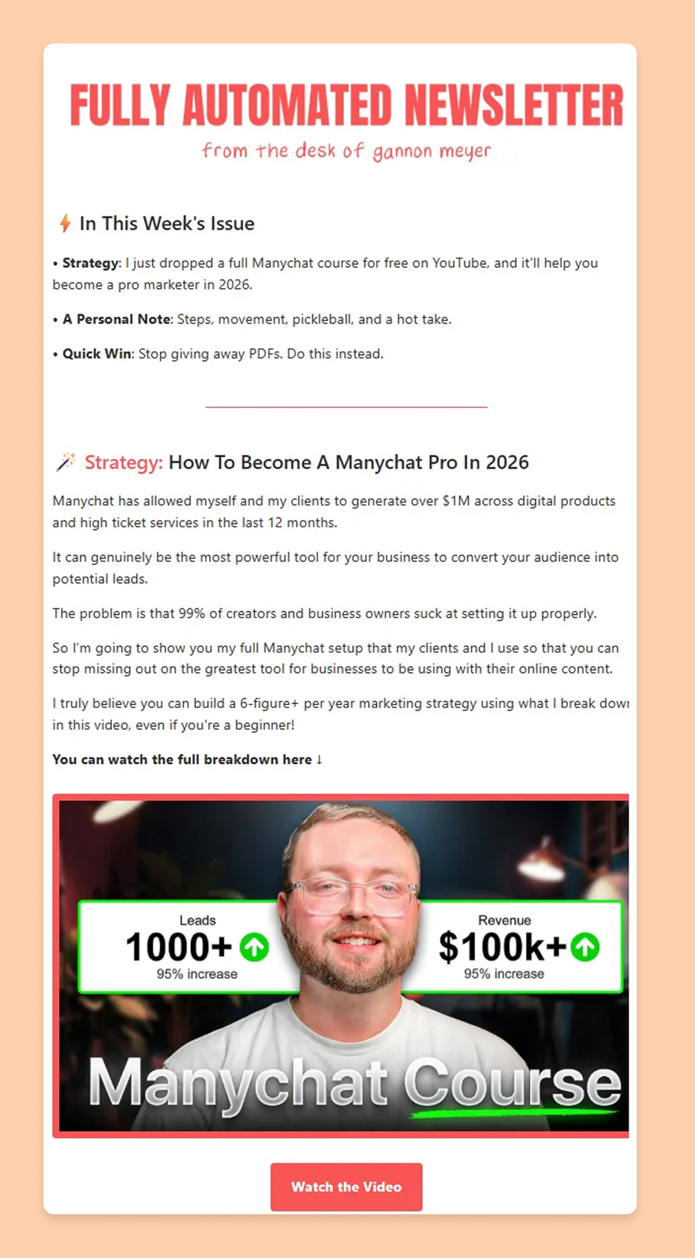 With 9,000 subscribers, 60+ email automations running, and a 45% average open rate, Gannon’s email list generates 2-3 sales from every newsletter he sends. His most recent bootcamp launch brought in over $50,000—primarily through email.