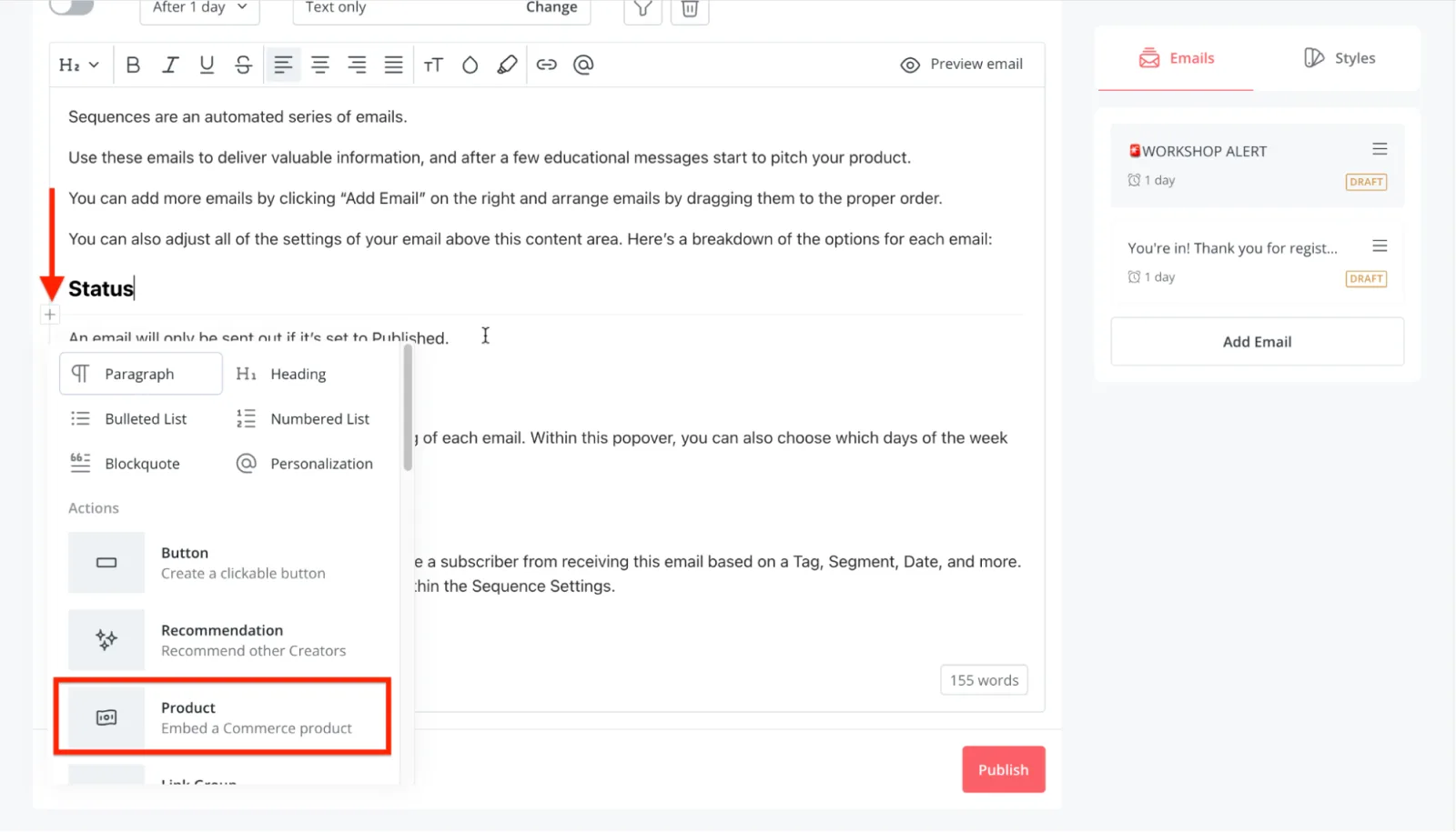 Step 4: Embed the product in your newsletter, nurture sequence, or an individual launch email. Simply go to the email, click on the + sign and select Product.