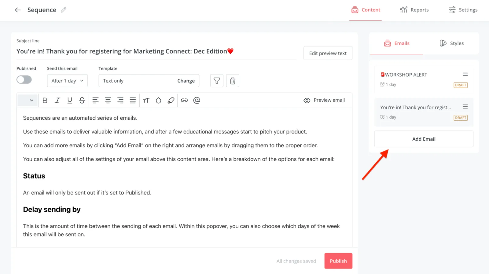 We’ve also put together a guide to crafting email sequences for workshop events with a detailed rundown on what to add to each email, when to send them, and how many emails might be too many.