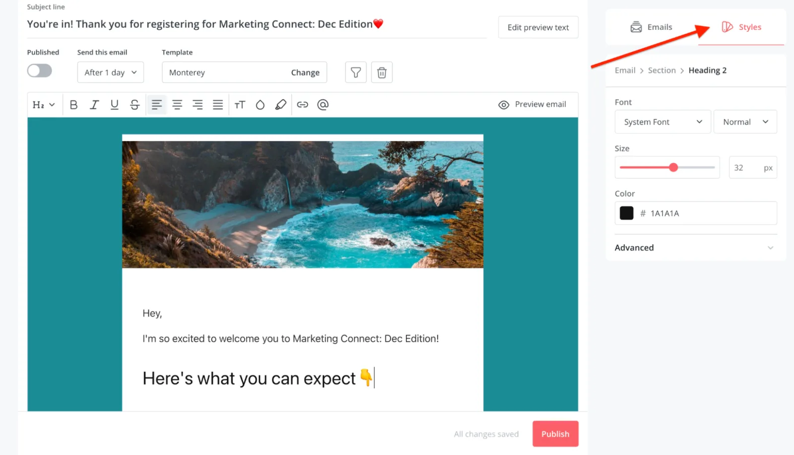 Step 5: Click on the Styles tab on the right to customize different elements of your email templates to suit your branding and design needs.
