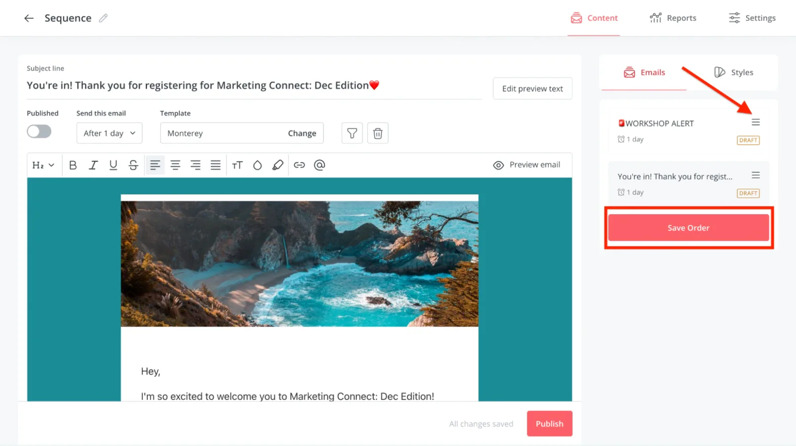 Step 6: Rearrange the order of your emails with a simple drag-and-drop at any time. Remember to click Save Order to lock it in.