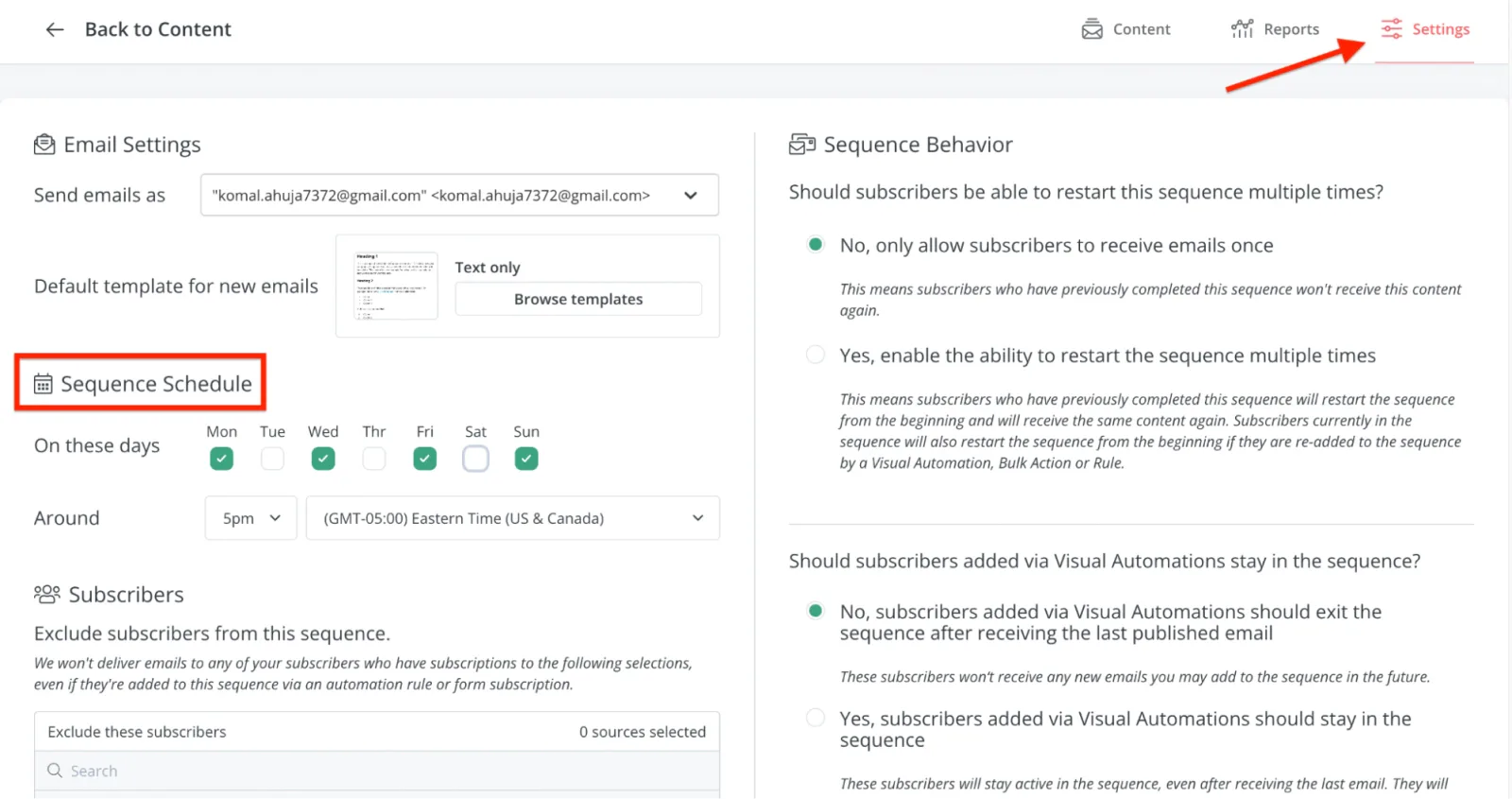 Step 7: Click on the Settings tab on the right to set the default days and times for your sequence emails.