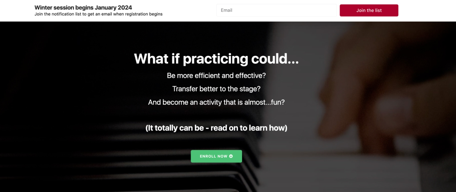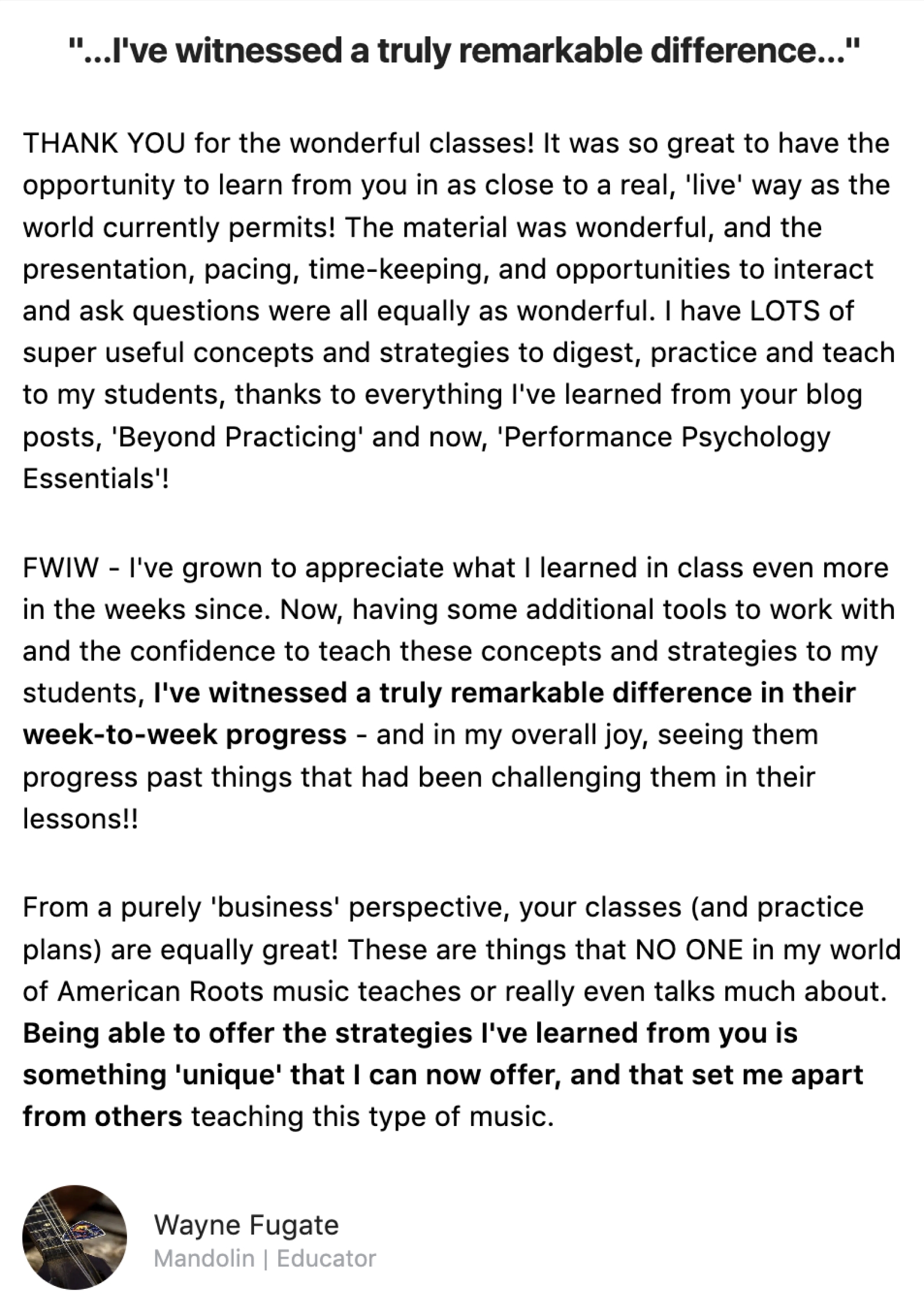 The goal of his workshops is to help musicians and students of all ages have a more positive experience both on stage and in the practice room through performance science strategies.
