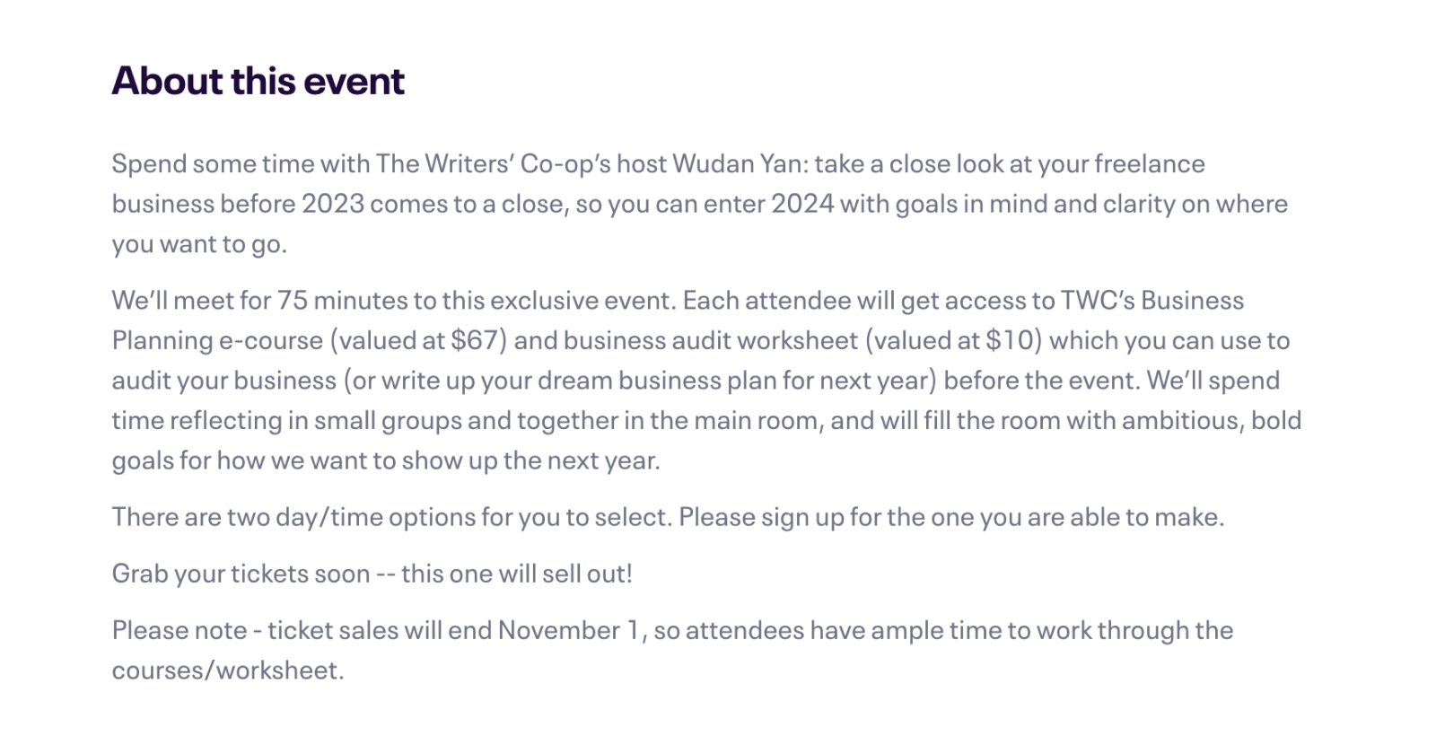 To foster engagement, Wudan hosts workshops in small groups of people, mostly held on Zoom. They use a standard format of discussing the topic and then encouraging idea-sharing and collaboration in breakout rooms where attendees can ask questions, get feedback, and interact with other people managing their freelance businesses.