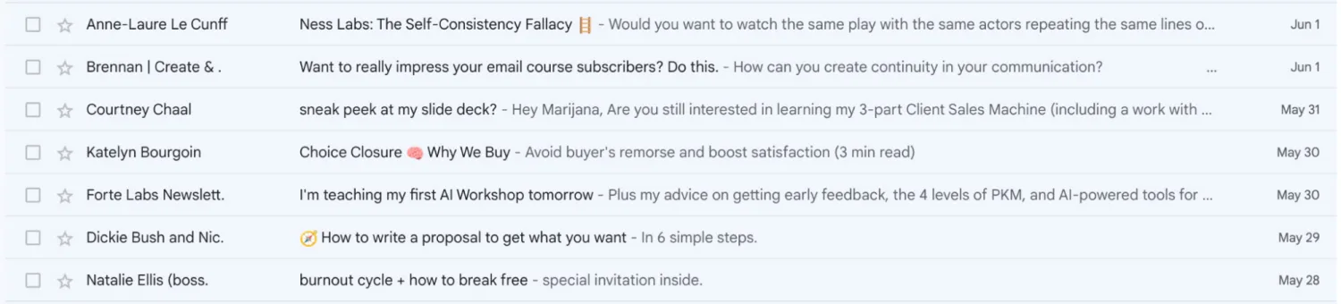- Experiment with subject line formulas. For example, Ness Labs’ newsletter always has its name in the subject line, as does the Why We Buy newsletter. Newsletters from Natalie Ellis and Bossbabe are always in lowercase and those from Dickie Bush and Ship 30 for 30 start with a compass emoji.