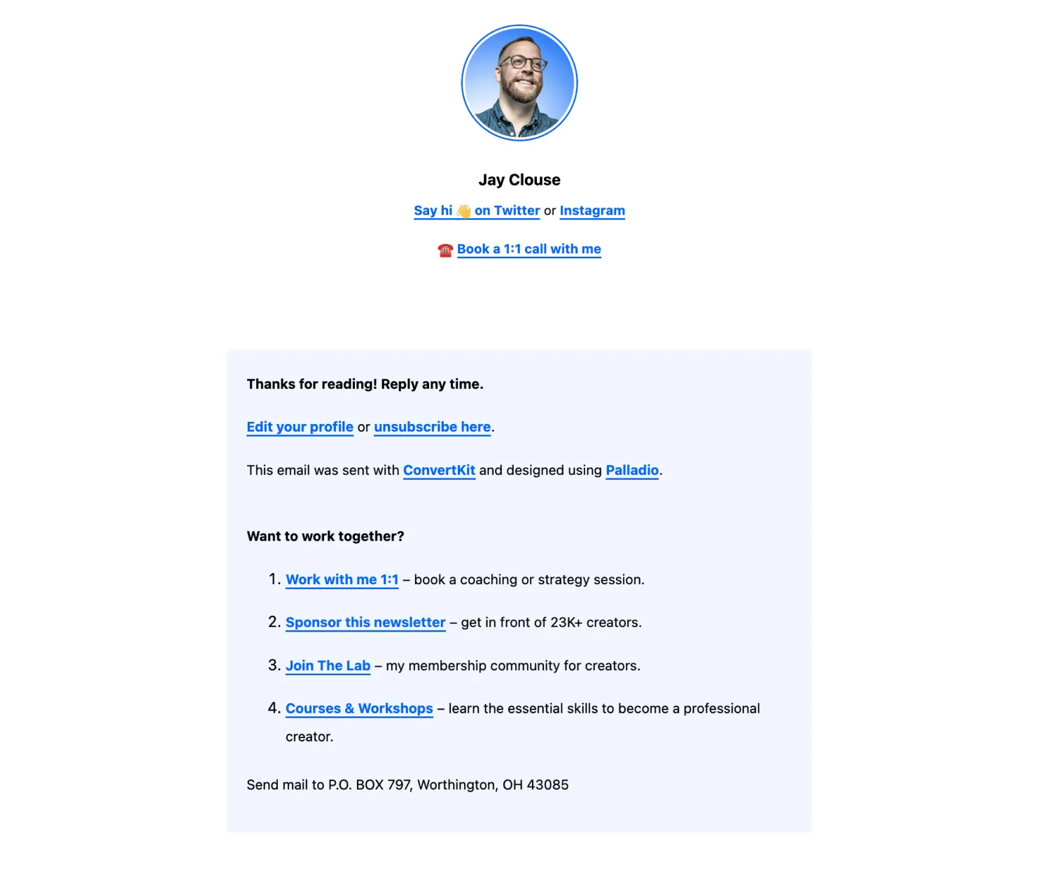 Jay Clouse’s email newsletter signature