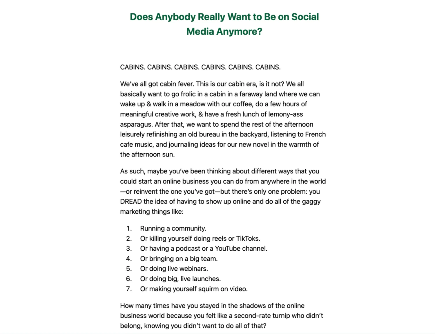 The opposite example is this bit from Ash Ambirge’s newsletter called Selfish Forever. Ash is loud, bold, and unapologetic: