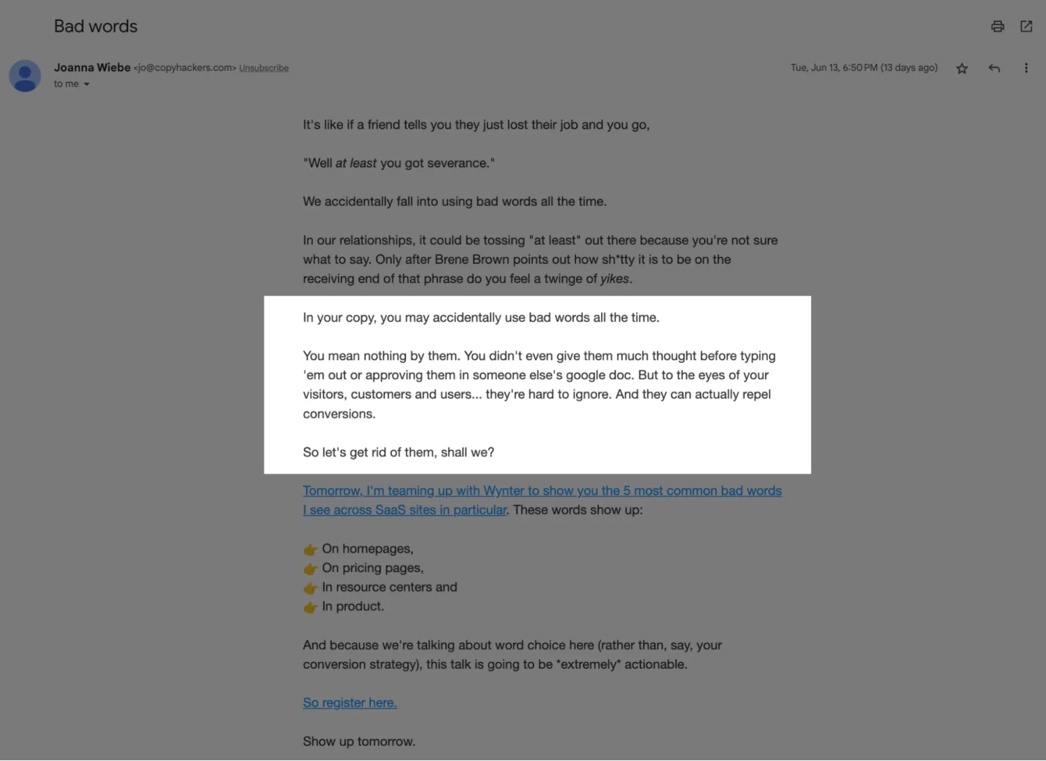 Joanna Wiebe’s email focuses on the reader to promote a Copyhackers webinar