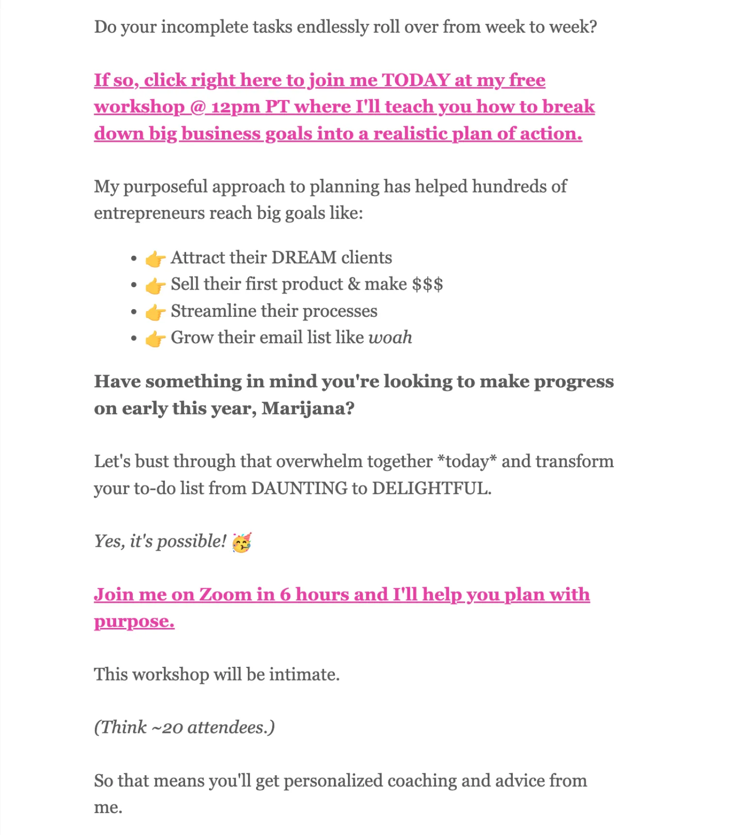 For example, here’s how Quinn Tempest, a business and marketing coach, promotes her free workshop through benefits (attract dream clients, stop feeling overwhelmed, make your to-do list delightful) instead of features: