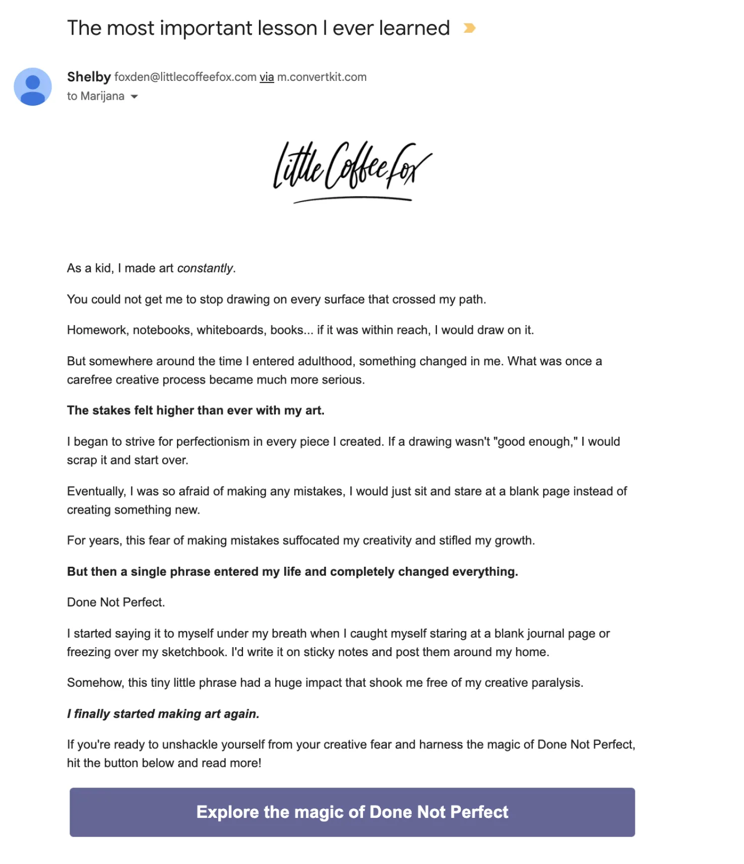 Shelby from Little Coffee Fox told a story about how her relationship with art changed in adulthood, which took her subscribers to a blog post on a related topic