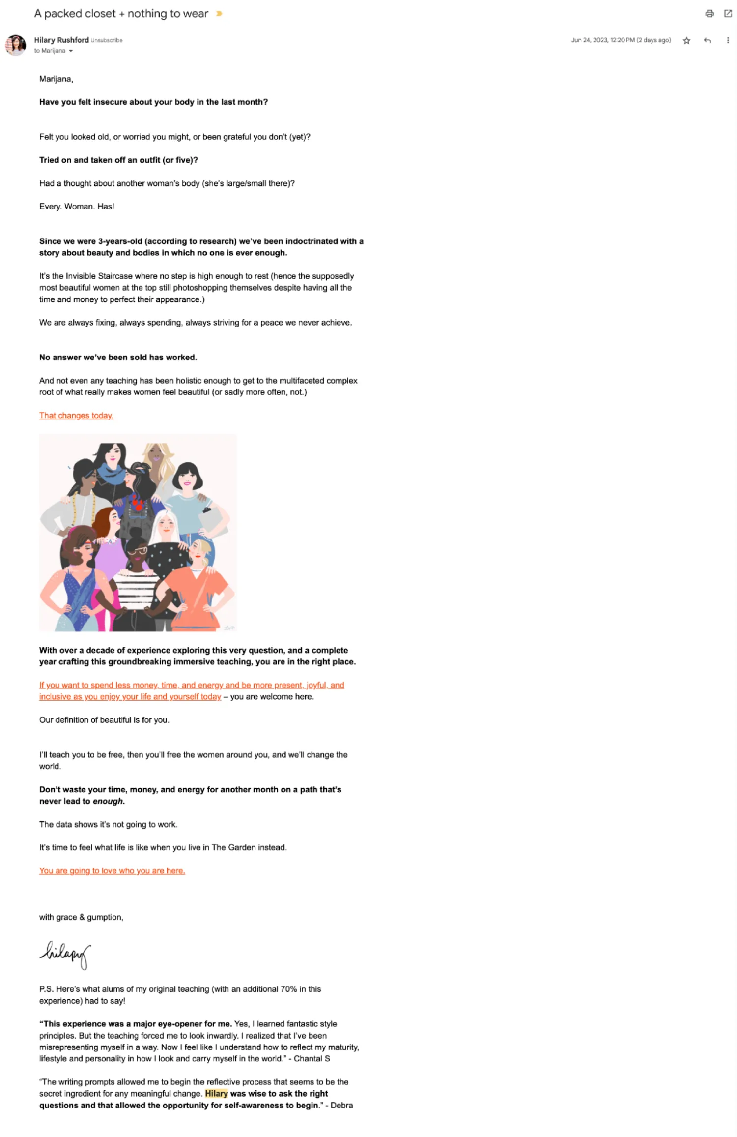 Hilary Rushford using conversion copy techniques like voice of the customer and social proof in one of her email newsletters that launches a product