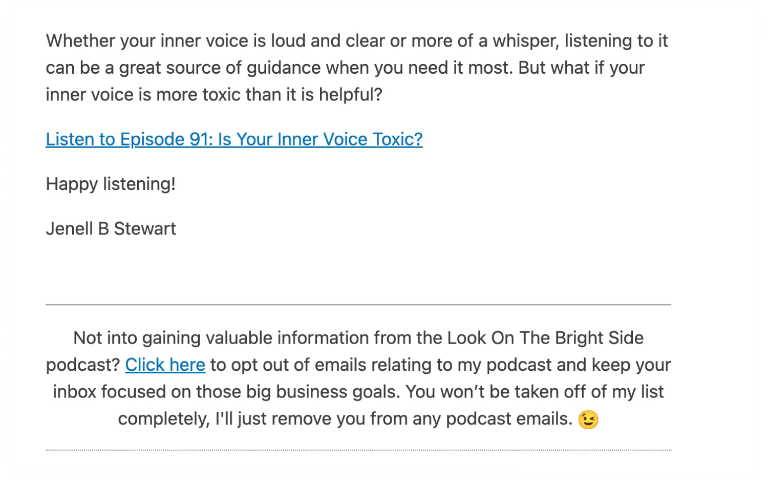 Email serves as Jenell’s focal point for the rest of her activities, whether participating in events, releasing her latest podcast episode, or launching something new. “I keep my audience updated on all things Jenell and what my business is doing,” she says. “I use email to communicate about the ins and outs of all of my programs, send them freebies or perks, offer support, and to sell and nurture my audience.”