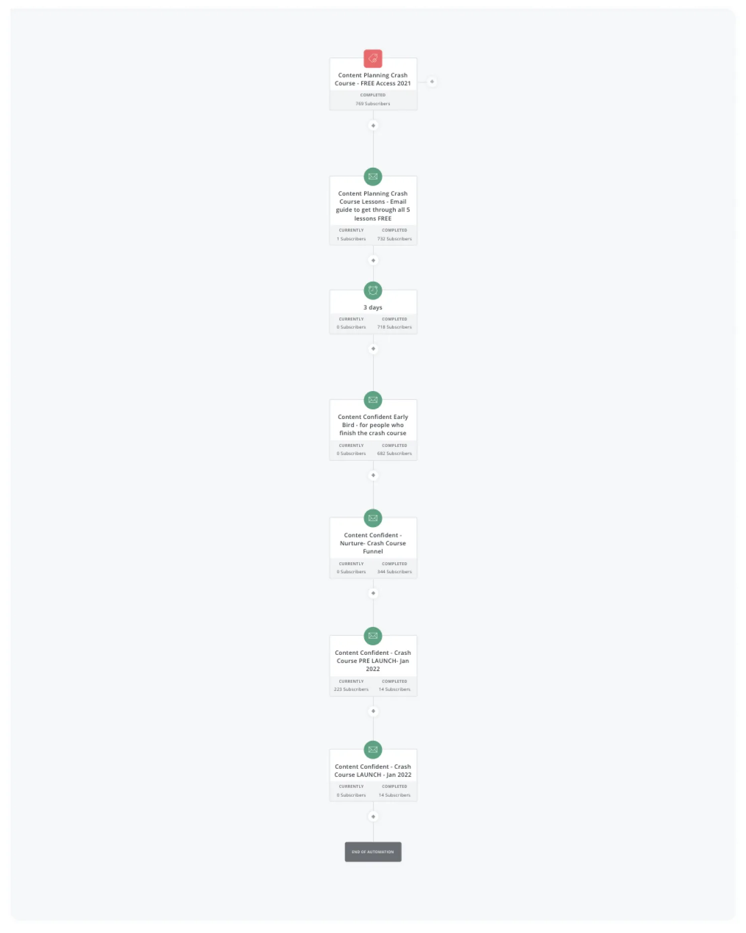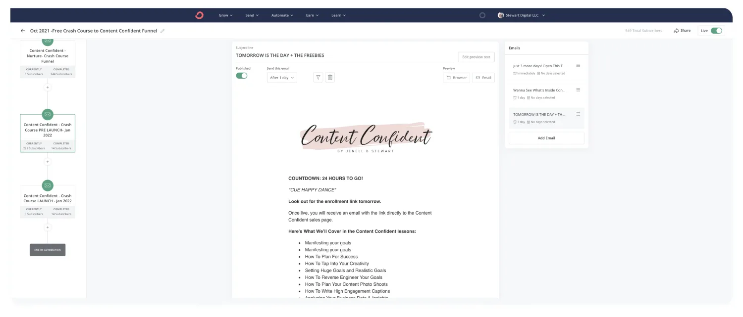While Jenell has her hands in all kinds of products, it’s her online community that’s the focus of her latest campaign. She put together a multi-stage automation that takes her email list from new subscriber to community member in just 23 days.