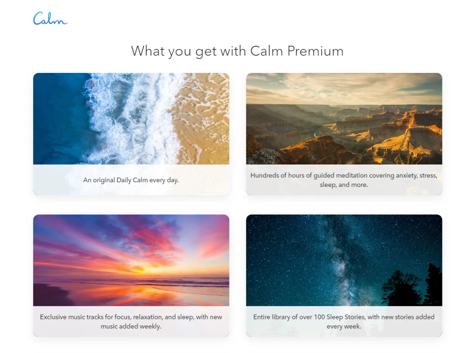 For example, this promotional page by Calm lists the benefits for its Premium users with a short CTA to try it for free.