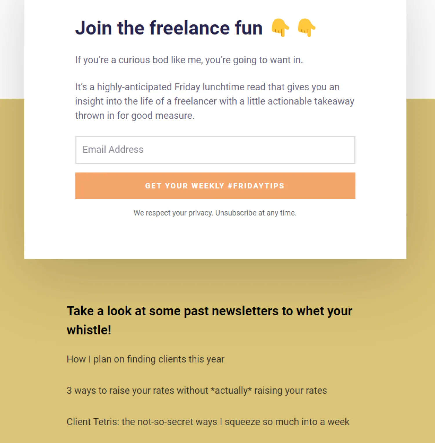 For example, Lizzie Davey attracts people to her newsletter with this standalone landing page, including past editions and other people’s reactions to her content.