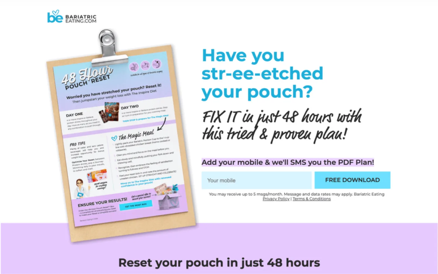 For example, this landing page by Bariatric Eating shows the offer in the hero section of the page. It also previews the freebie and uses microcopy to convince prospects to share their mobile number.
