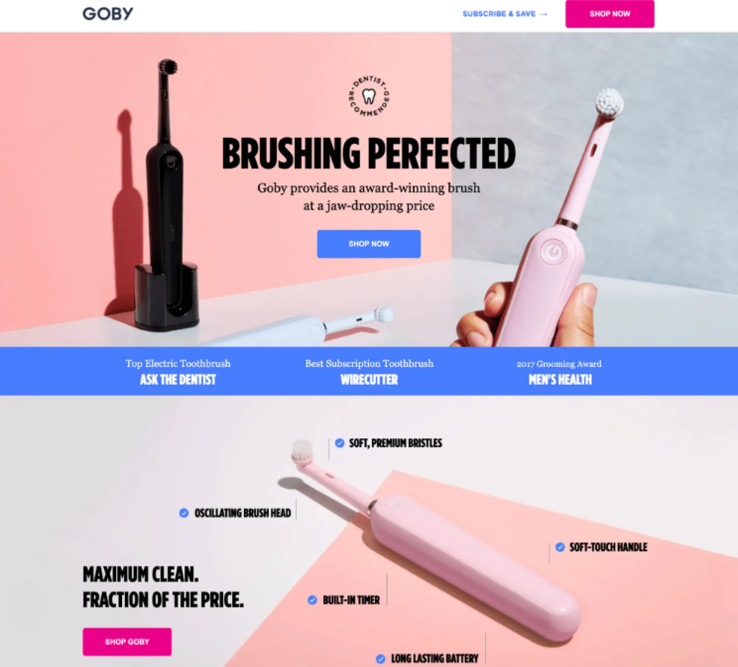 The oral care brand placed two images at the start of this landing page. One spotlights the product’s look from different angles, and the other conveys the unique features of these brushes. Both have a small CTA to send visitors to the store.