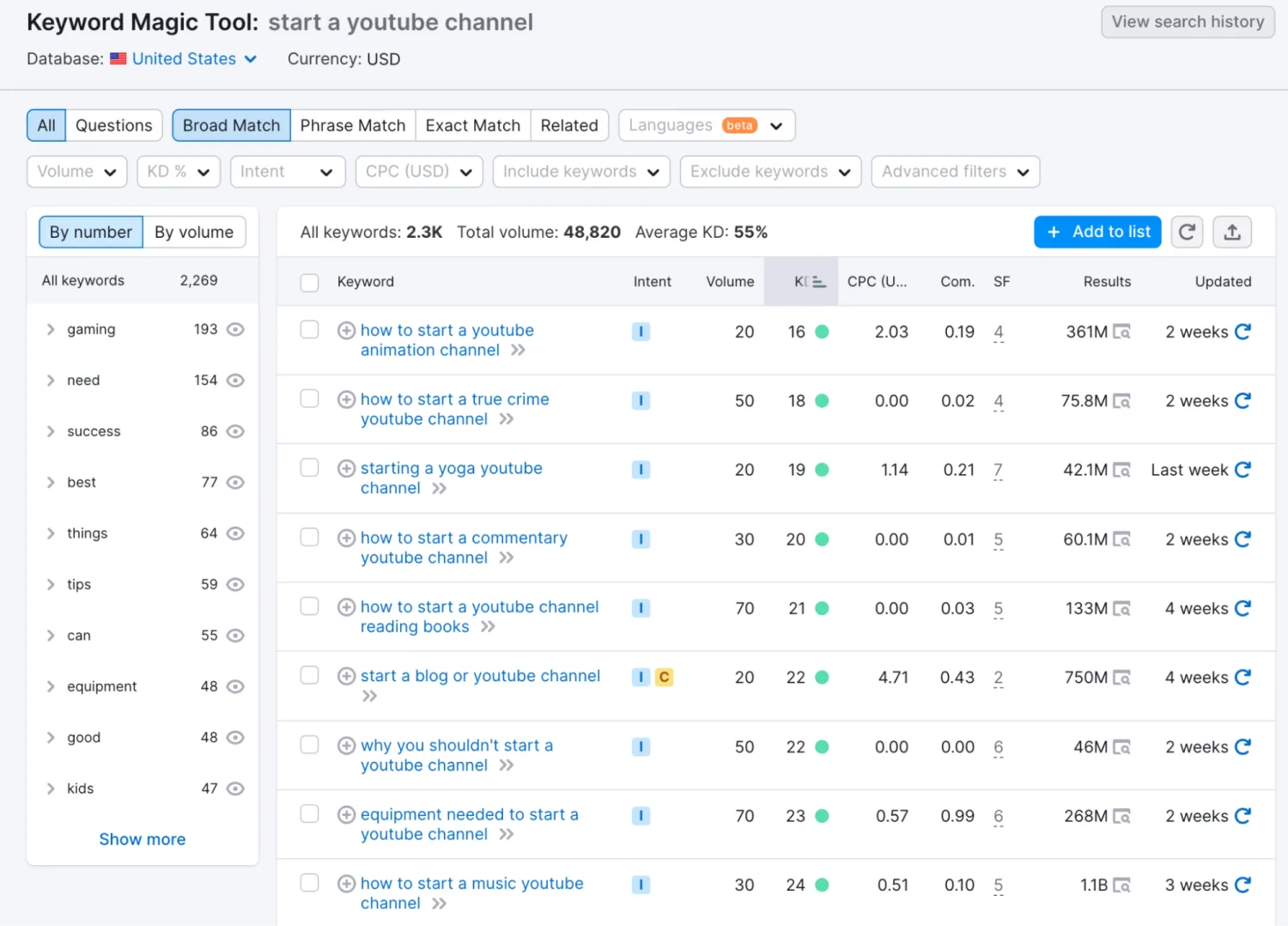 For example, according to Semrush, it is very difficult to rank for “youtube starting a channel,” but quite easy to rank for “starting a yoga youtube channel” with a similar traffic potential.