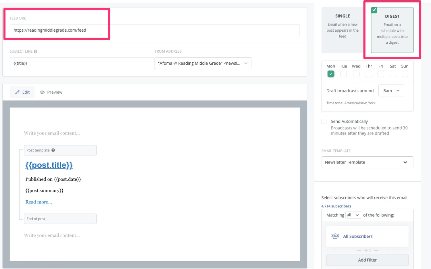 Add your site’s feed address (which is typically [your site’s URL]/feed) and choose the Digest option. It will automatically populate the email with your most recent posts.