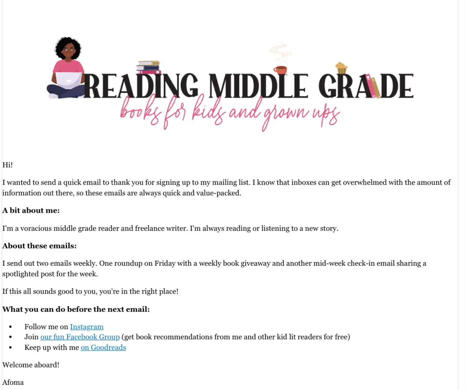For example, in my welcome email for my blog newsletter, I introduce myself and share what subscribers need to know about the newsletter, including its content and frequency. Finally, I share some social media links where subscribers can find and connect with me before the next email.