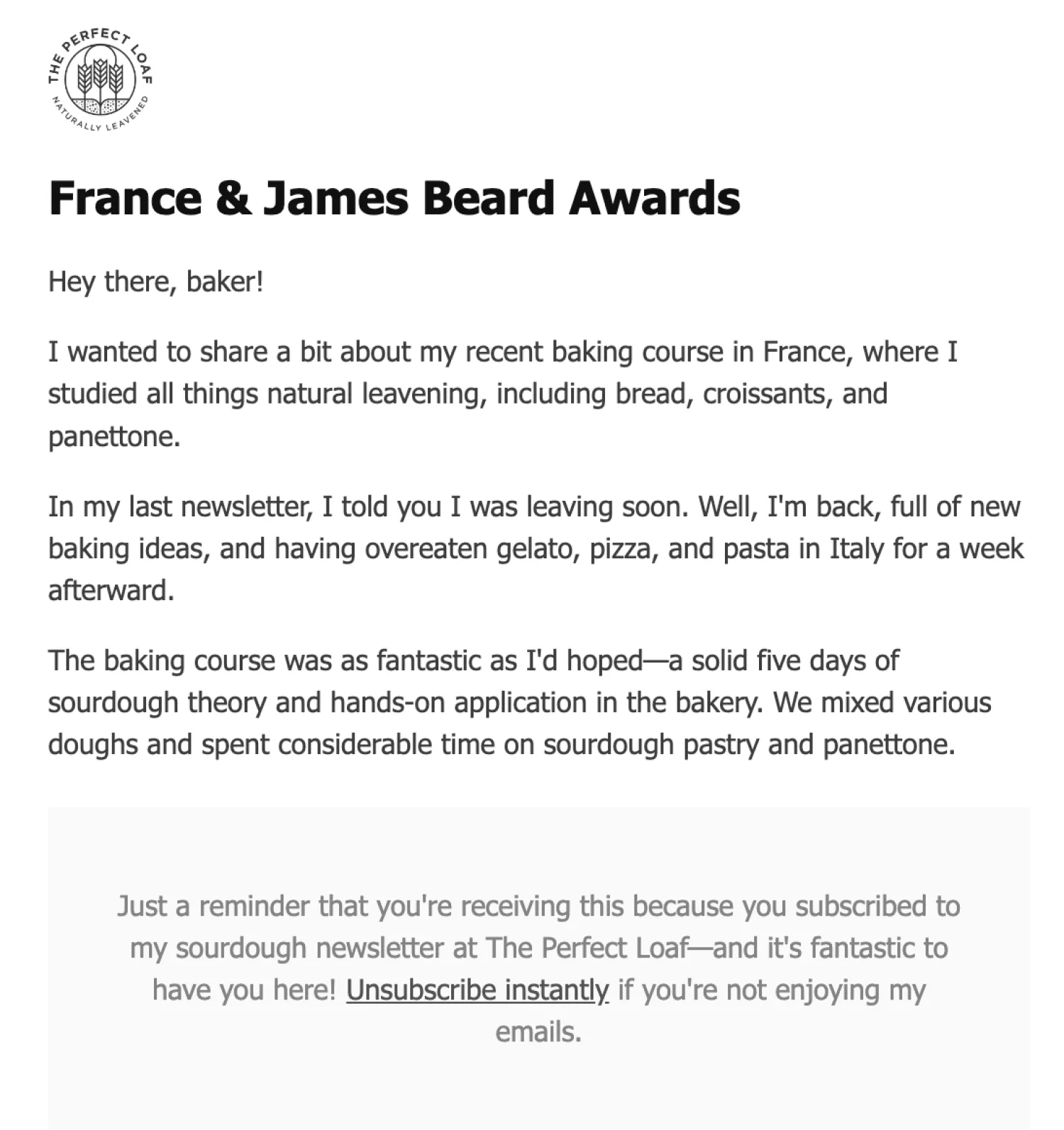 Maurizio Leo includes his logo for The Perfect Loaf at the top of each newsletter.