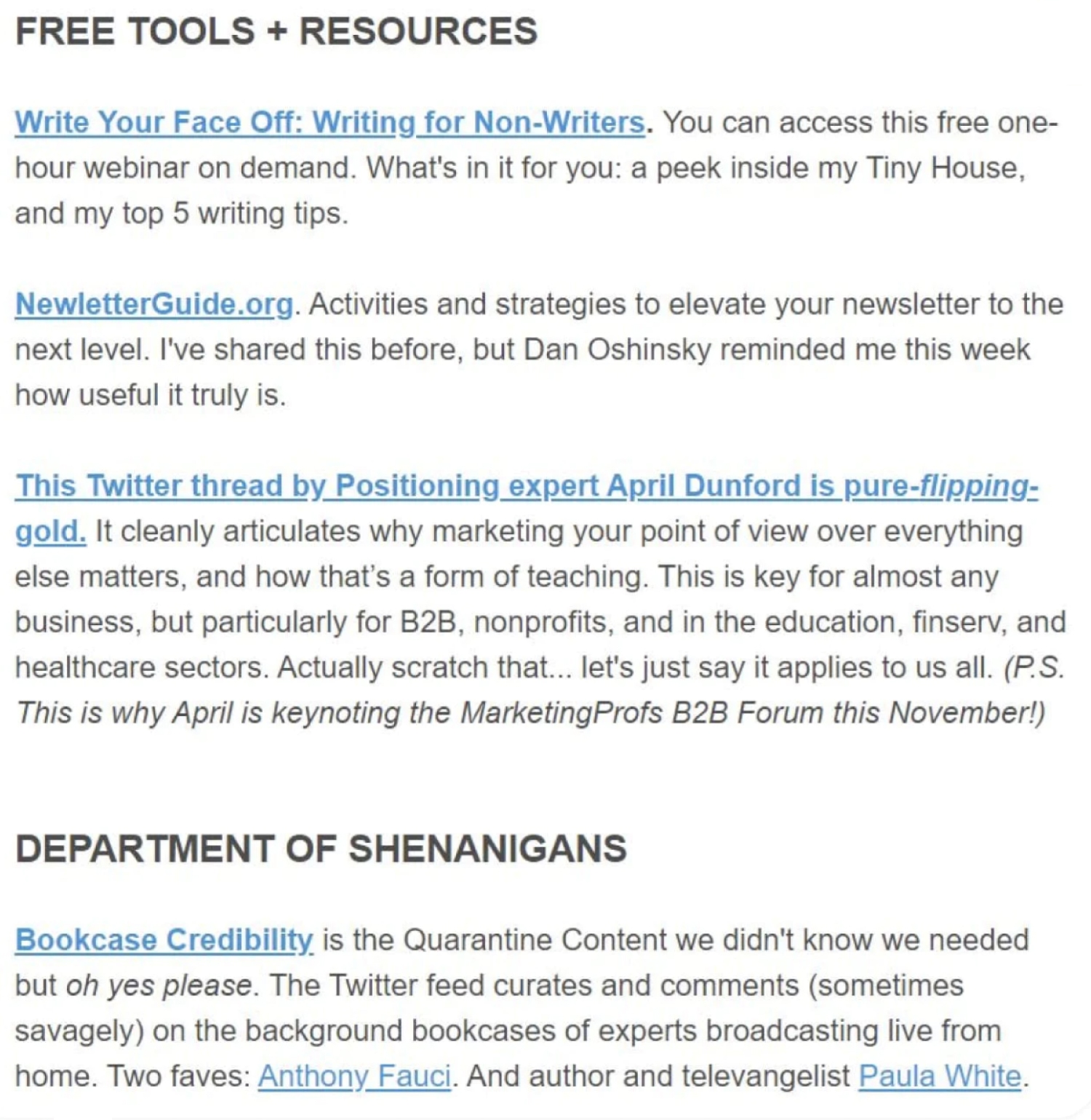 Ann Handley often sends out long email newsletters, and her headers allow readers to quickly find sections they want to read.