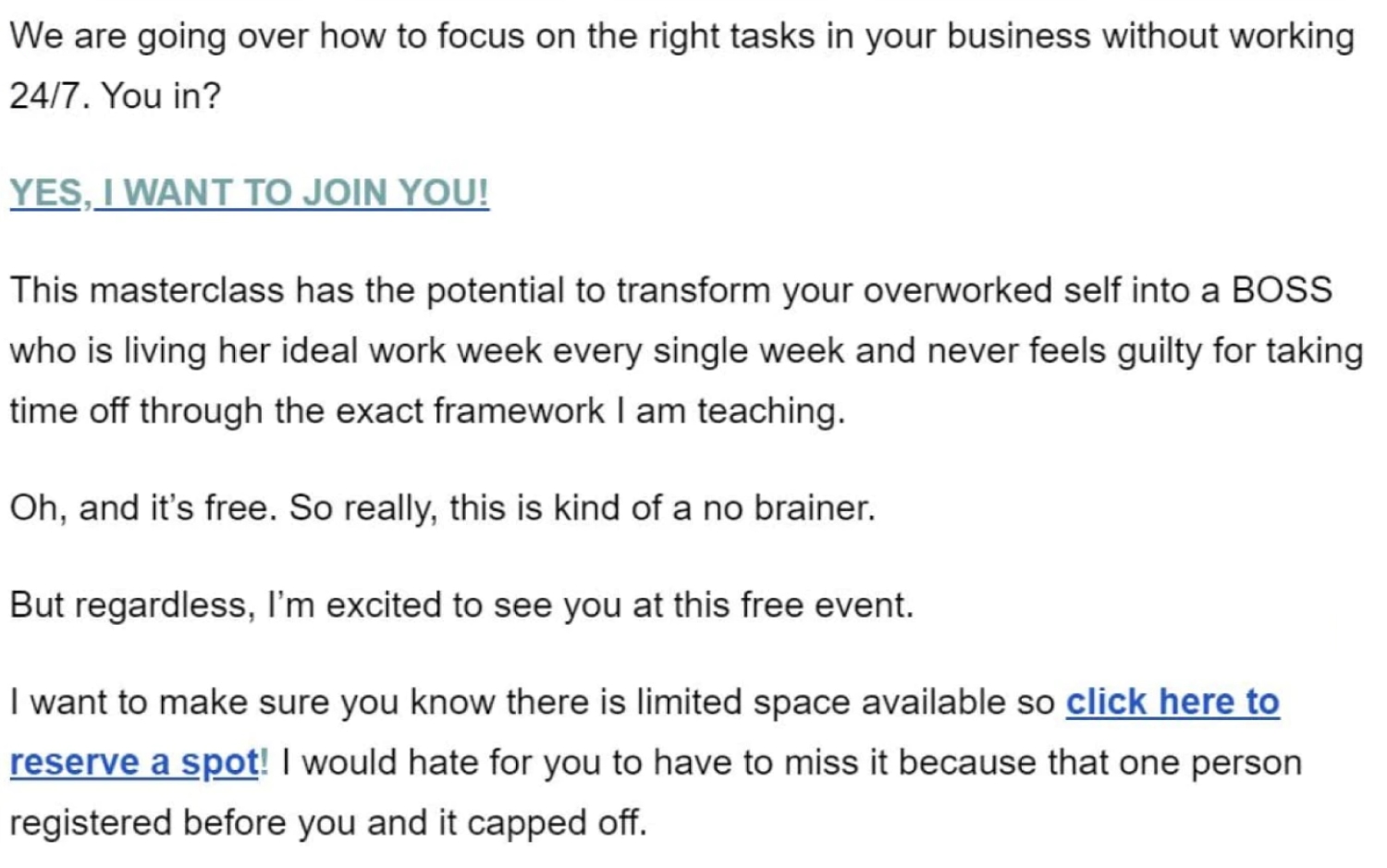Holly, the creator of A Branch of Holly, has added her CTA multiple times in her email newsletter so readers can easily sign up for her masterclass.