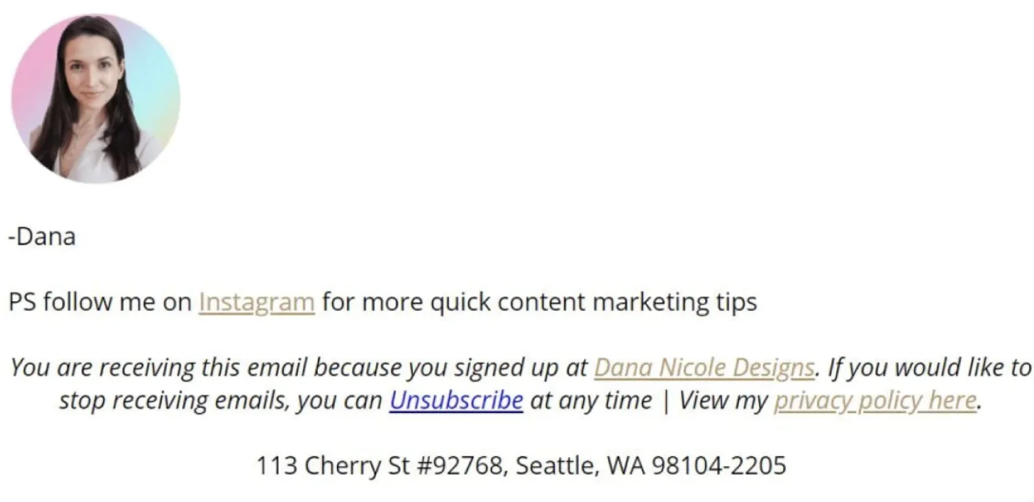 Dana Nicole has a photo, social links, and unsubscribe link in her footer.