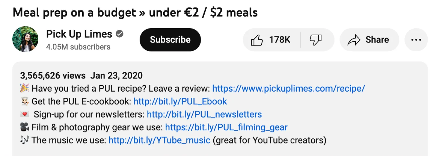 The Pick Up Limes YouTube channel uses different bit.ly links to share the newsletter page, a cookbook landing page, and more. Image via Pick Up Limes.
