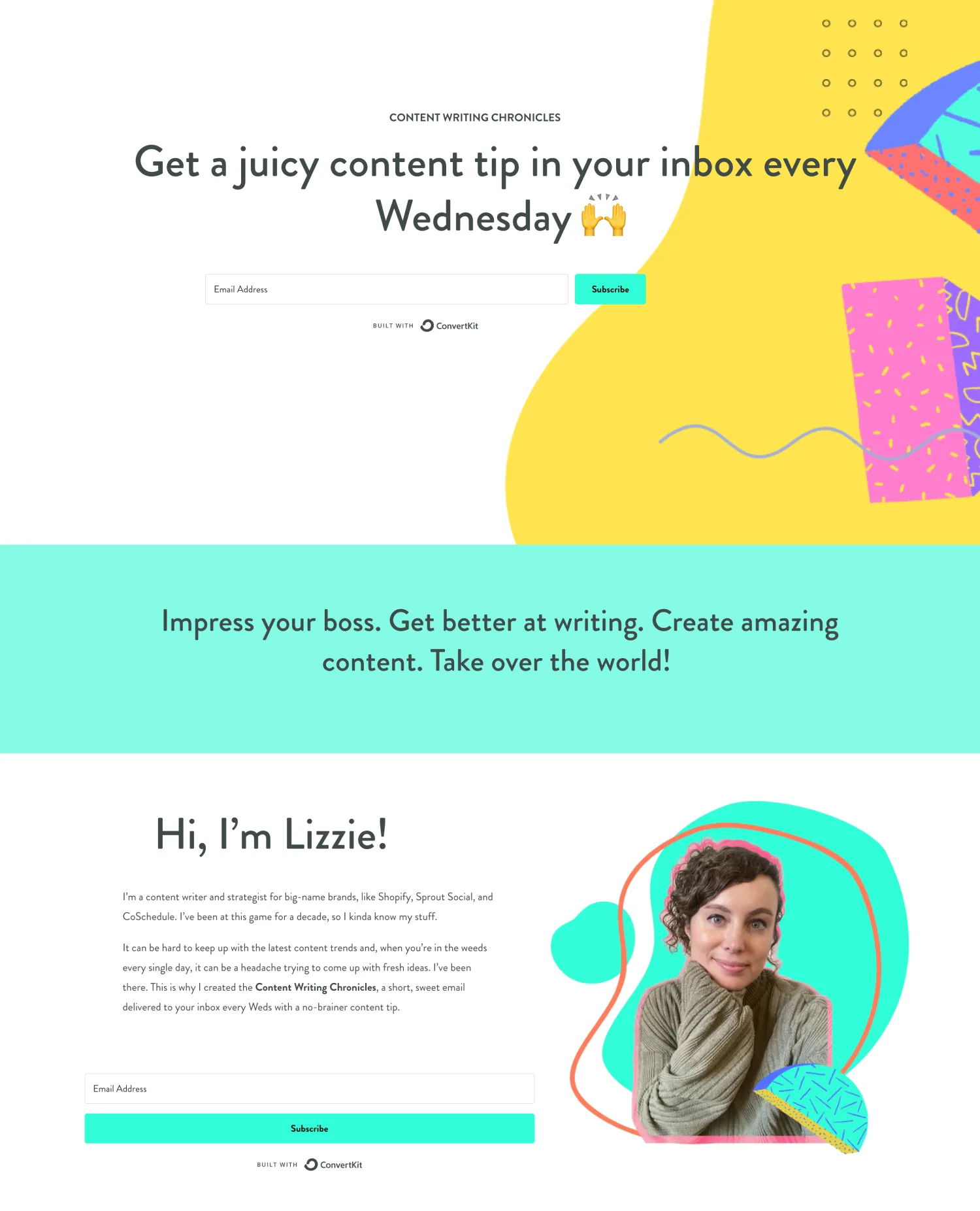 - This newsletter landing page is structured like a personal introduction or a profile page, subtly introducing the option of signing up to the newsletter