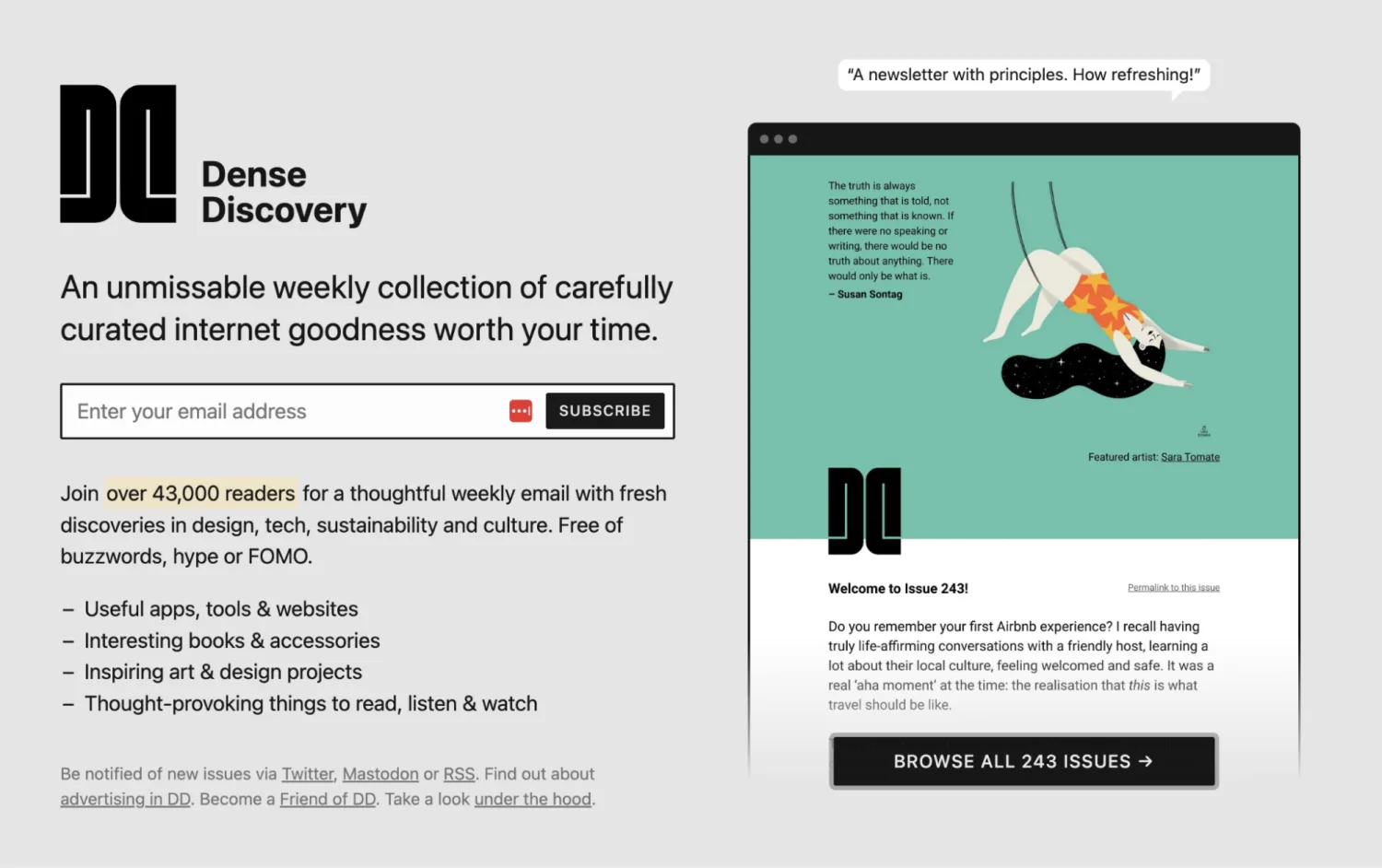Thinking about how you want to help readers may inspire your newsletter name. For example, Dense Discovery aims to help people feel inspired and think critically. Image via Dense Discovery.