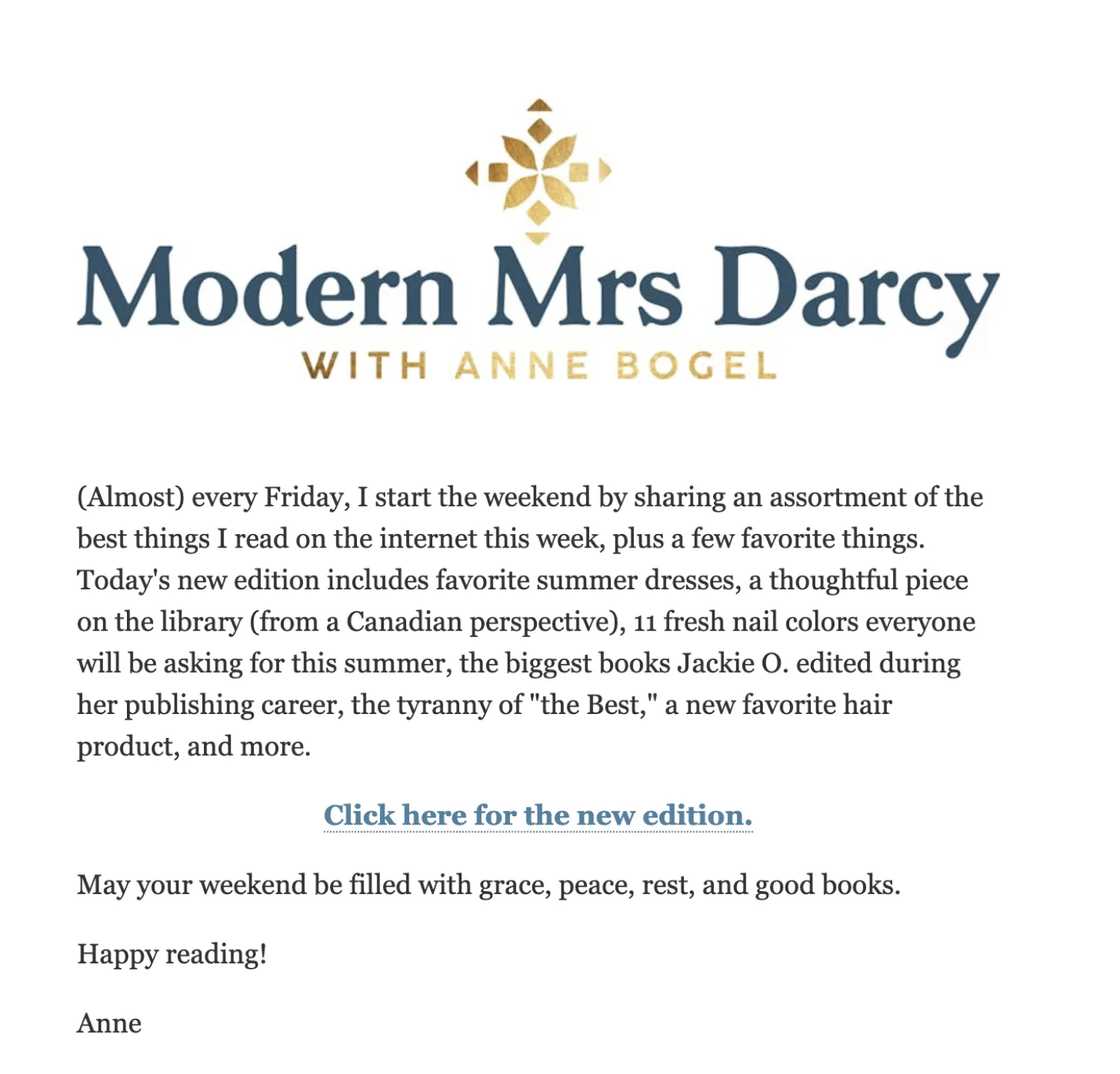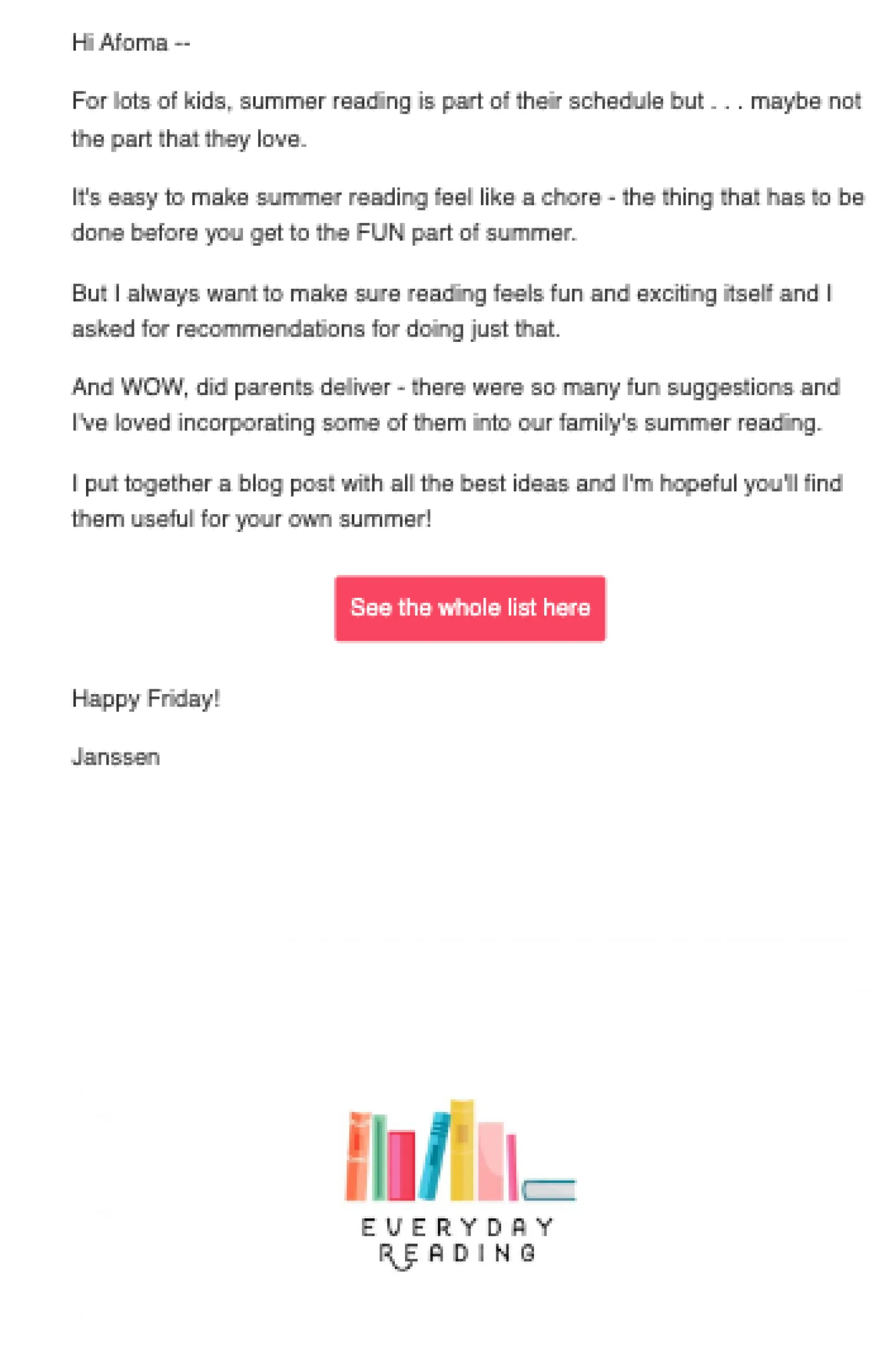If you want to make your emails feel more personal and connect your face to the brand, consider a stylized footer. Janssen of Everyday Reading uses a well-designed footer to showcase her newsletter and brand name.