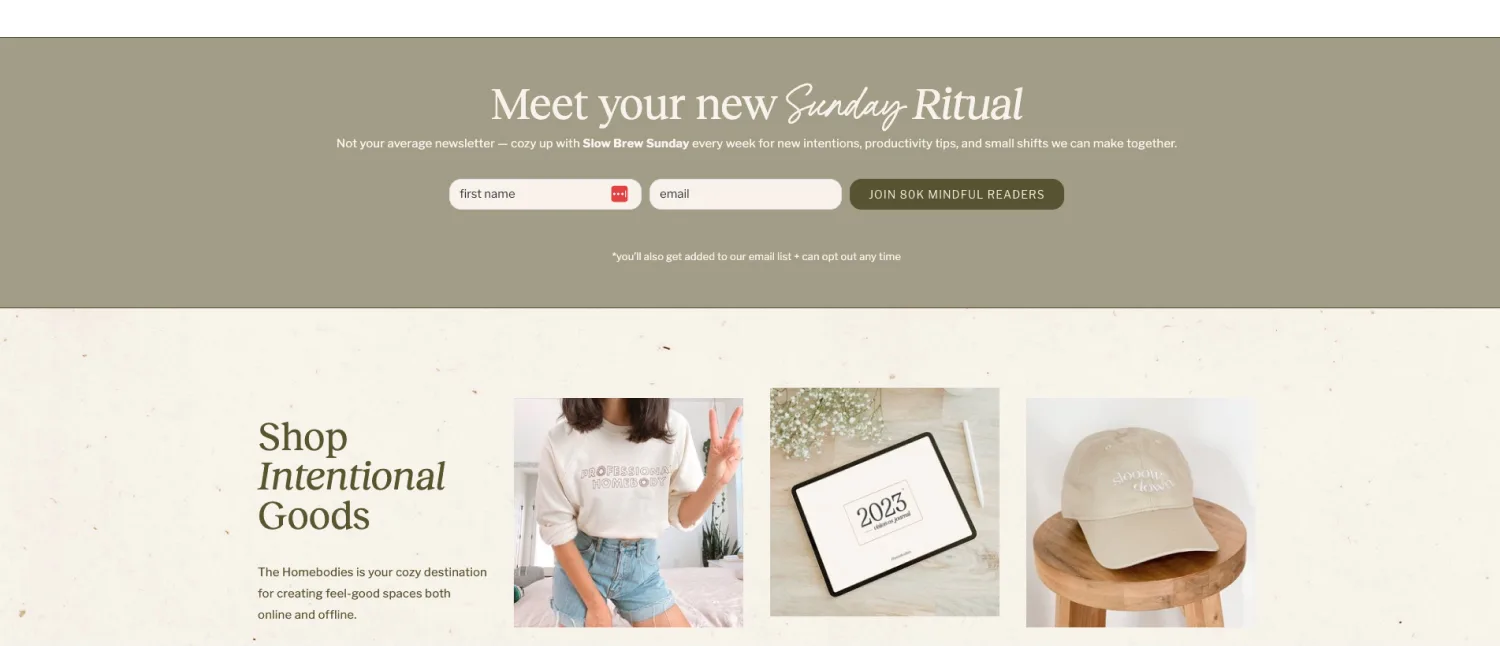 Personalized content is key to growing your newsletter, and a creative name designates a space for your best content. You can use this exclusivity to your advantage on your newsletter’s landing page, just like Teela Cunningham does with her weekly newsletter, the Tuesday Tribe. As part of the tribe, the people in her newsletter are the “first to nab special deals.”