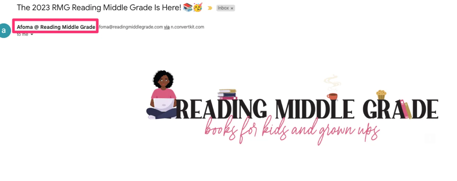 For example, I include both my name and business name in the “from” section. Sending my emails from “Afoma @ Reading Middle Grade” puts me front and center as the creator while also giving context about my brand.