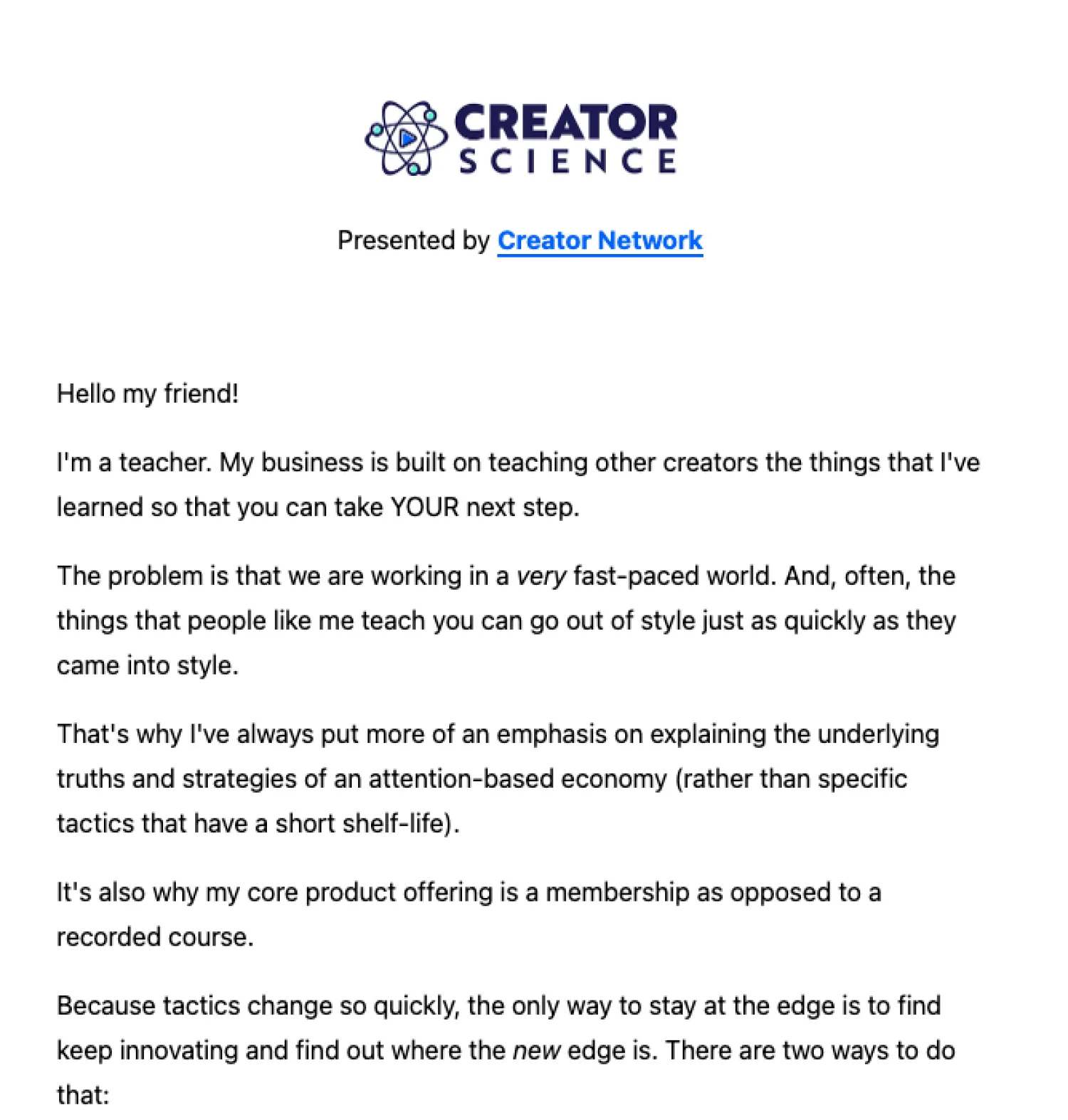 In the example from Jay Clouse’s Creator Science below, the message starts with the blog’s logo. Adding a header image is a simple way to add personality to your newsletter design. Just make sure to add alt text to preserve deliverability.