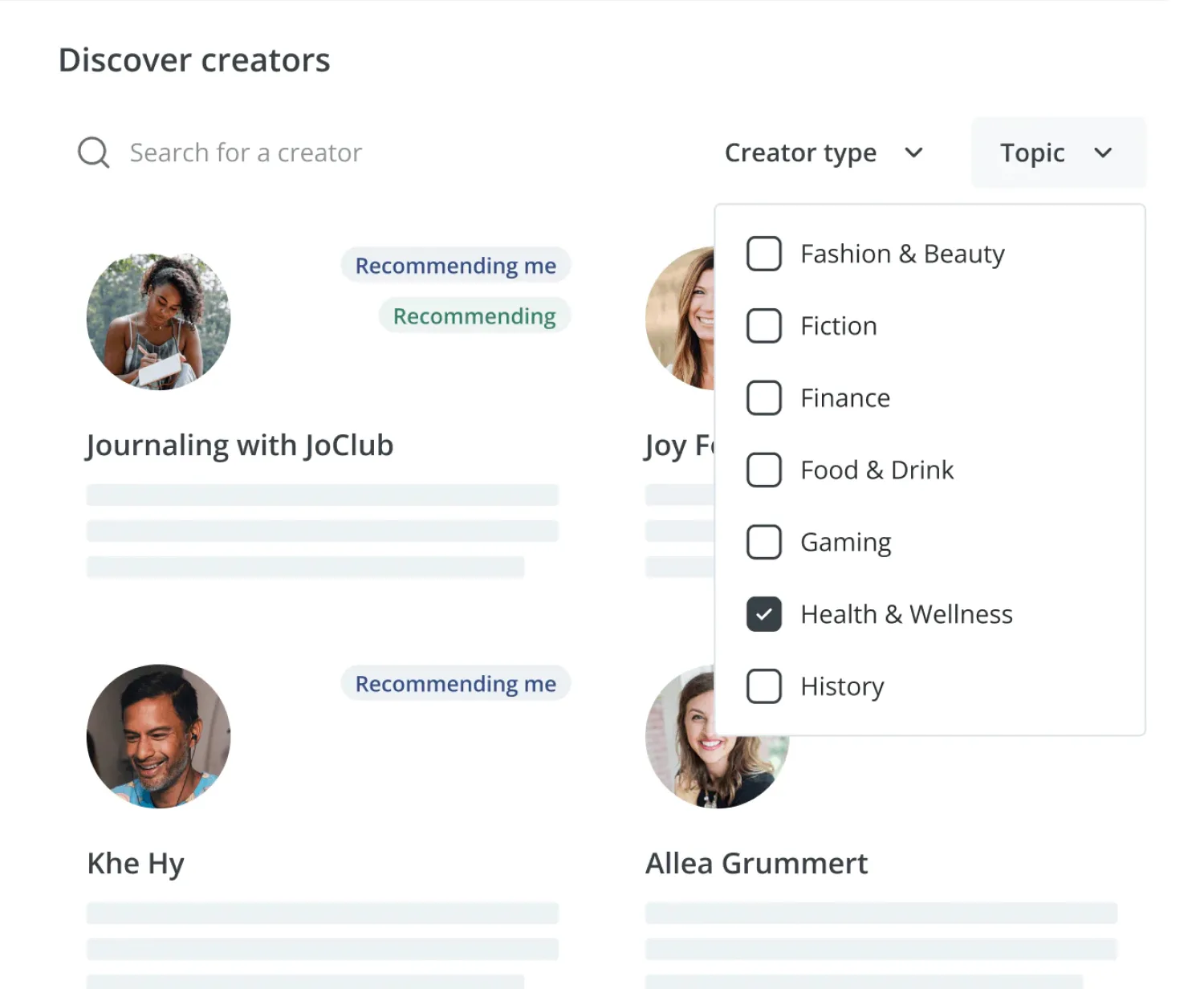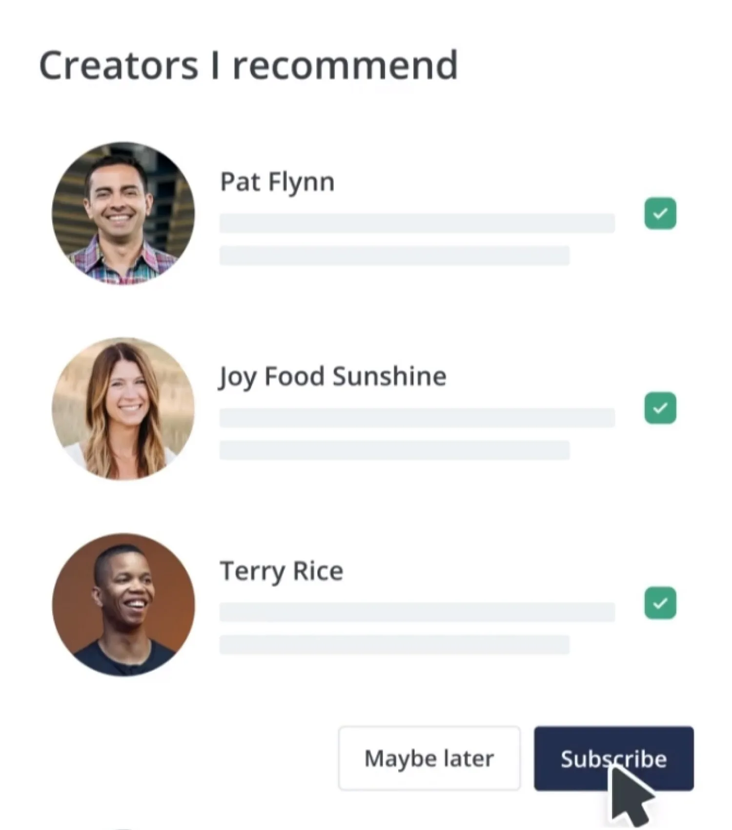 Now, when someone signs up for your email list, they’ll be directed to a prompt that displays the creators you recommend. They can choose which ones to subscribe to.