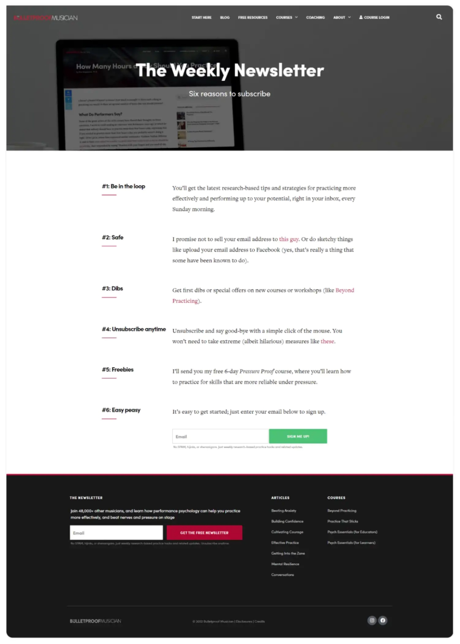 And musician Noa Kageyama gives readers six reasons to subscribe right on his newsletter landing page.