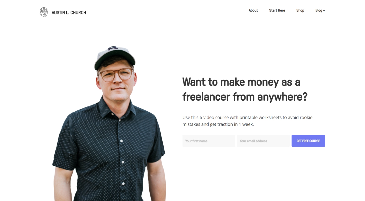 The first thing you notice when you open Austin Church’s website is a call-to-action that encourages visitors to subscribe and get a free course.