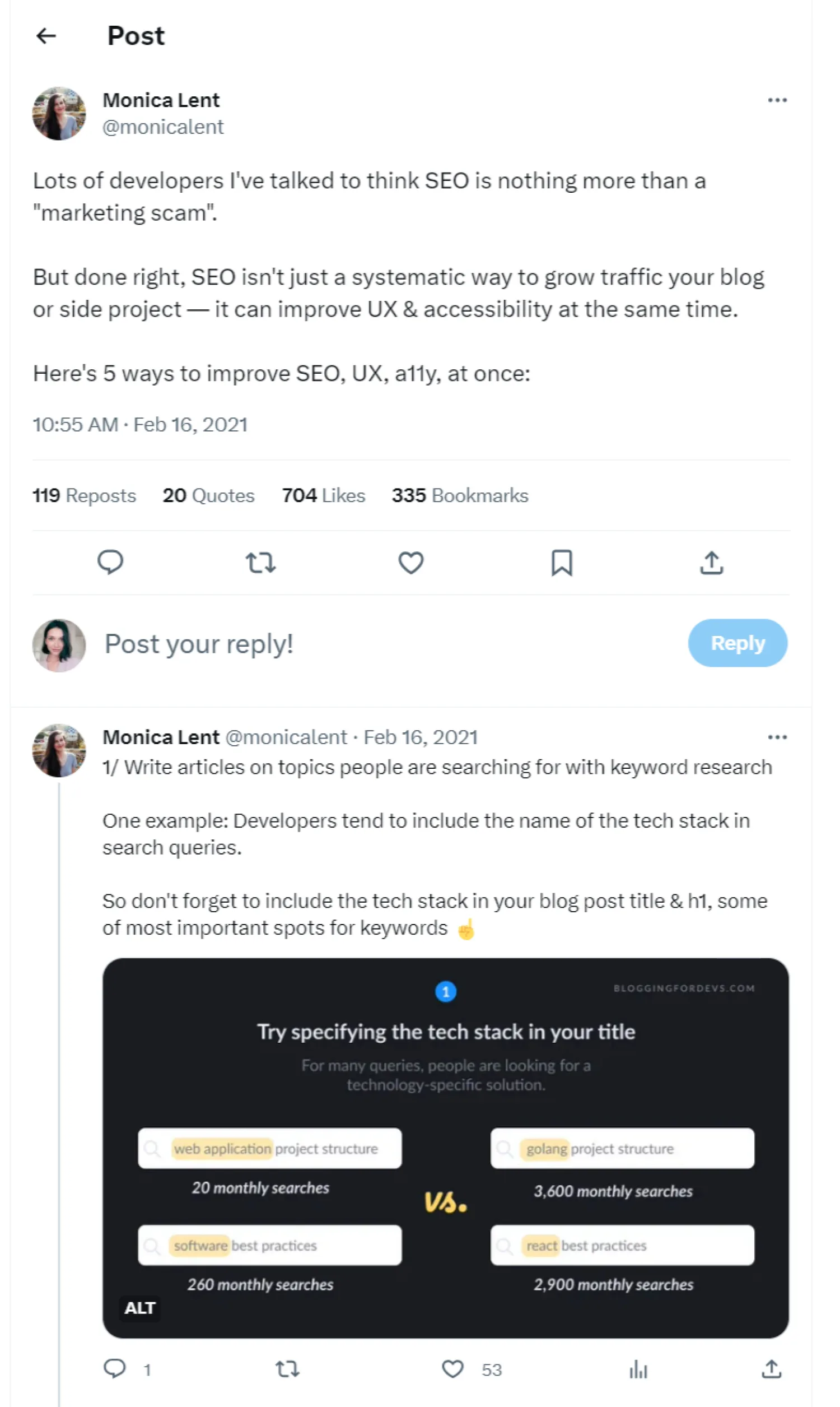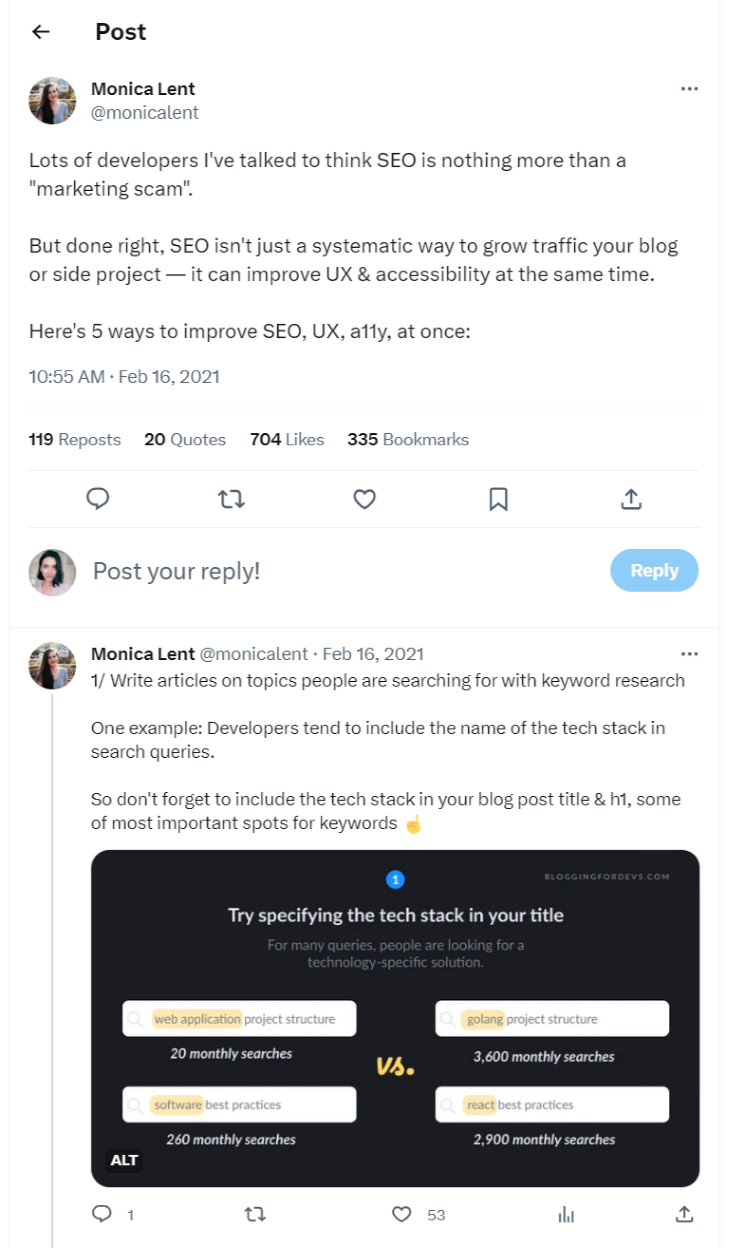 Monica Lent, who built Blogging for Devs—a newsletter and paid online community—uses X threads for newsletter promotion.