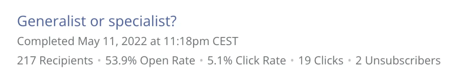 Kjell’s subject line asking a simple question around what is better – to be a generalist or specialist got a 53.9% open rate. Image via Kjell Vandevyvere.