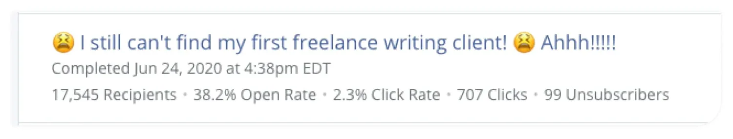 Elna Cain targets a relatable emotion every early freelancer faces – not getting their first client with this subject line that has an open rate of 38.2%. Image via Elna Cain.